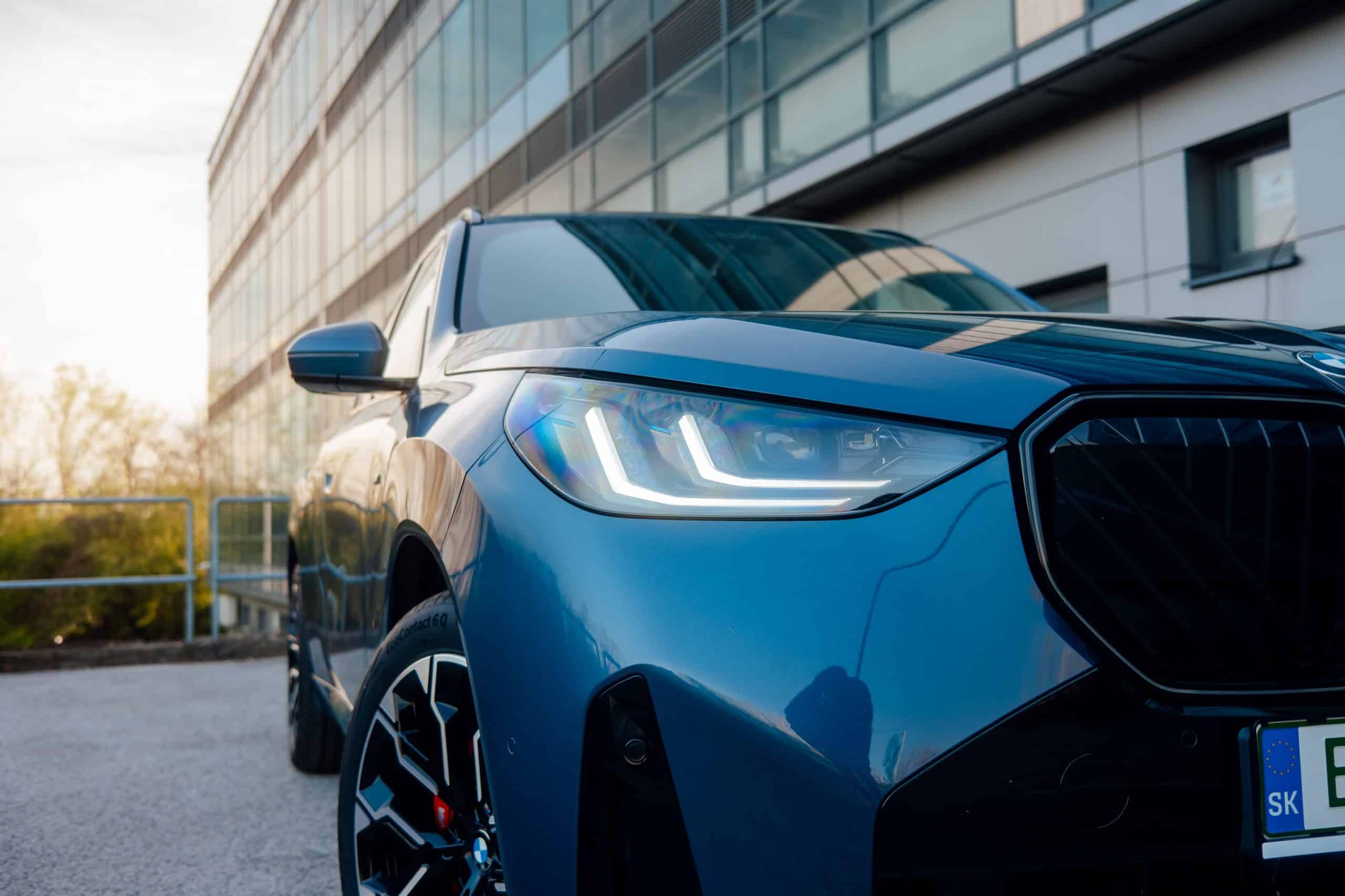 Automakers typically showcase well-equipped versions of their cars, and this X3 is no exception. The plug-in hybrid crossover is finished in optional Arctic Race Blue metallic paint and rides on 20-inch (1036 M) wheels. Its blacked-out kidney grille with illuminated contouring isn’t standard, nor are the adaptive LED matrix headlights with blue accents.