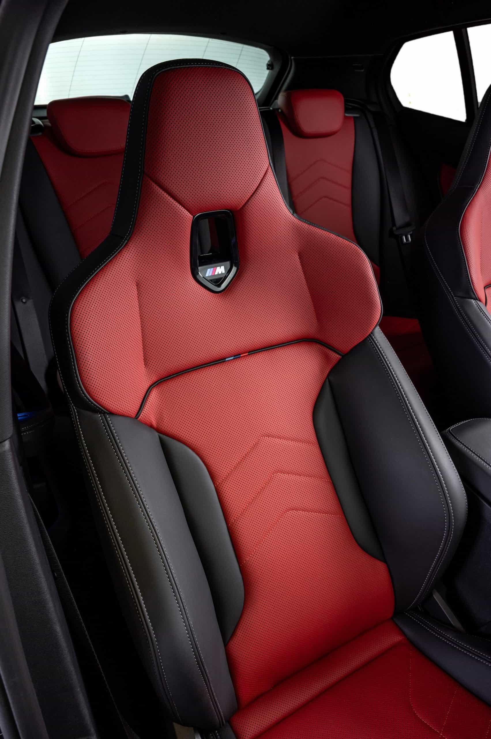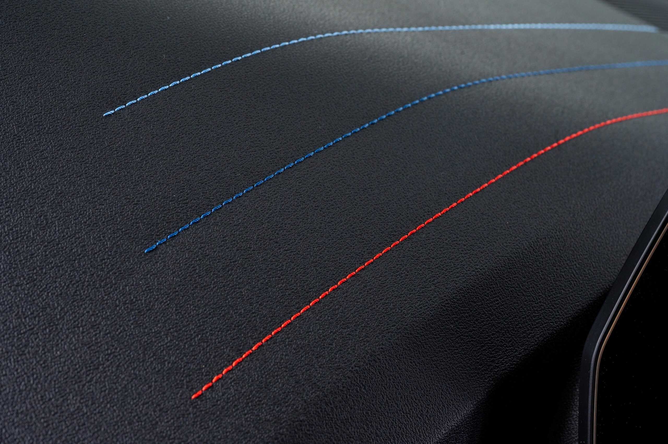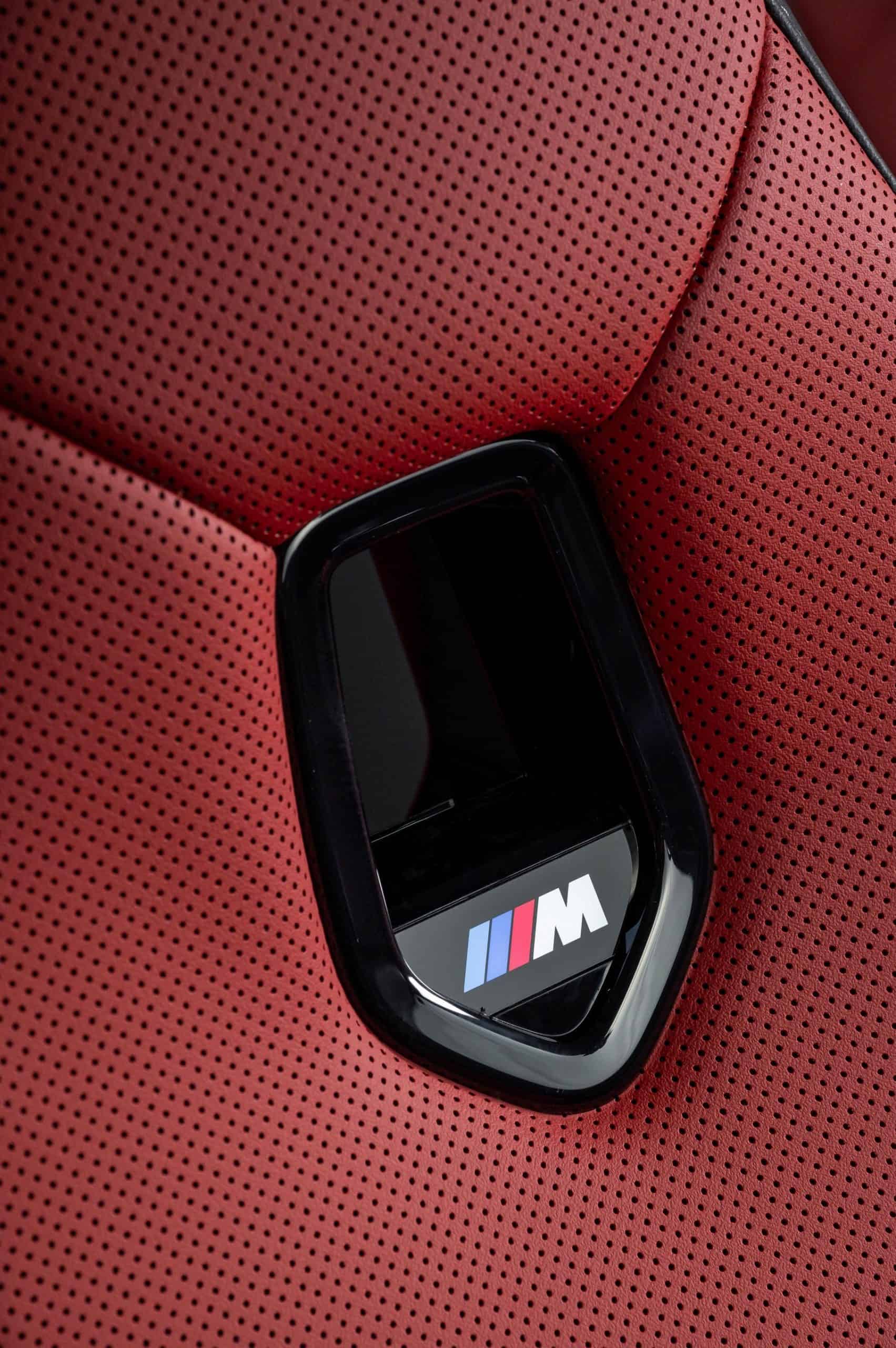 The M theme continues inside, where the body-hugging front seats feature an illuminated M logo in the integrated headrests, mirroring BMW’s full M models. Additionally, the iconic tri-color stitching appears on the dashboard and steering wheel, which also features a red 12 o’clock mark. The ambient lighting reflects the signature blue, violet, and red scheme.