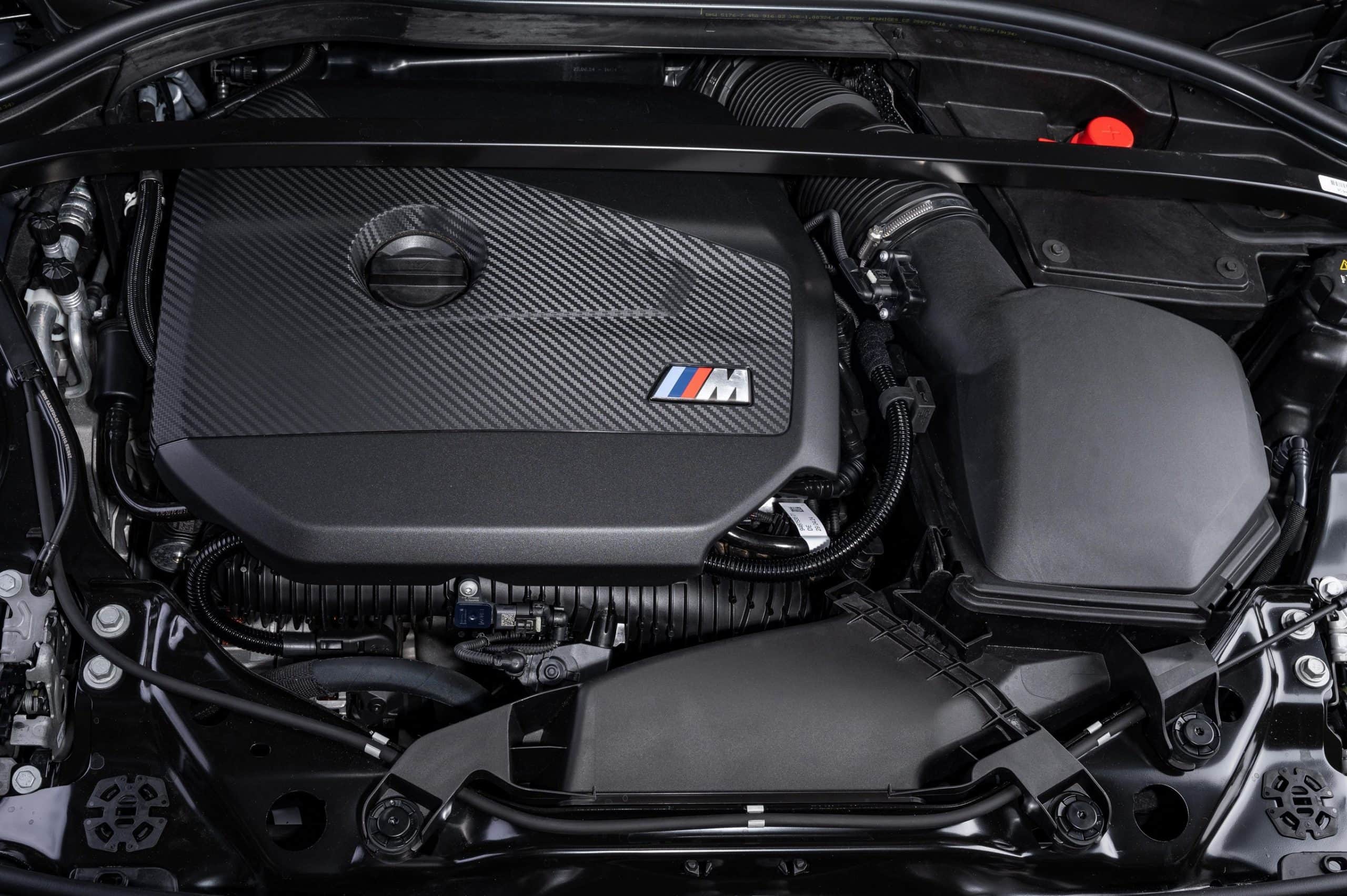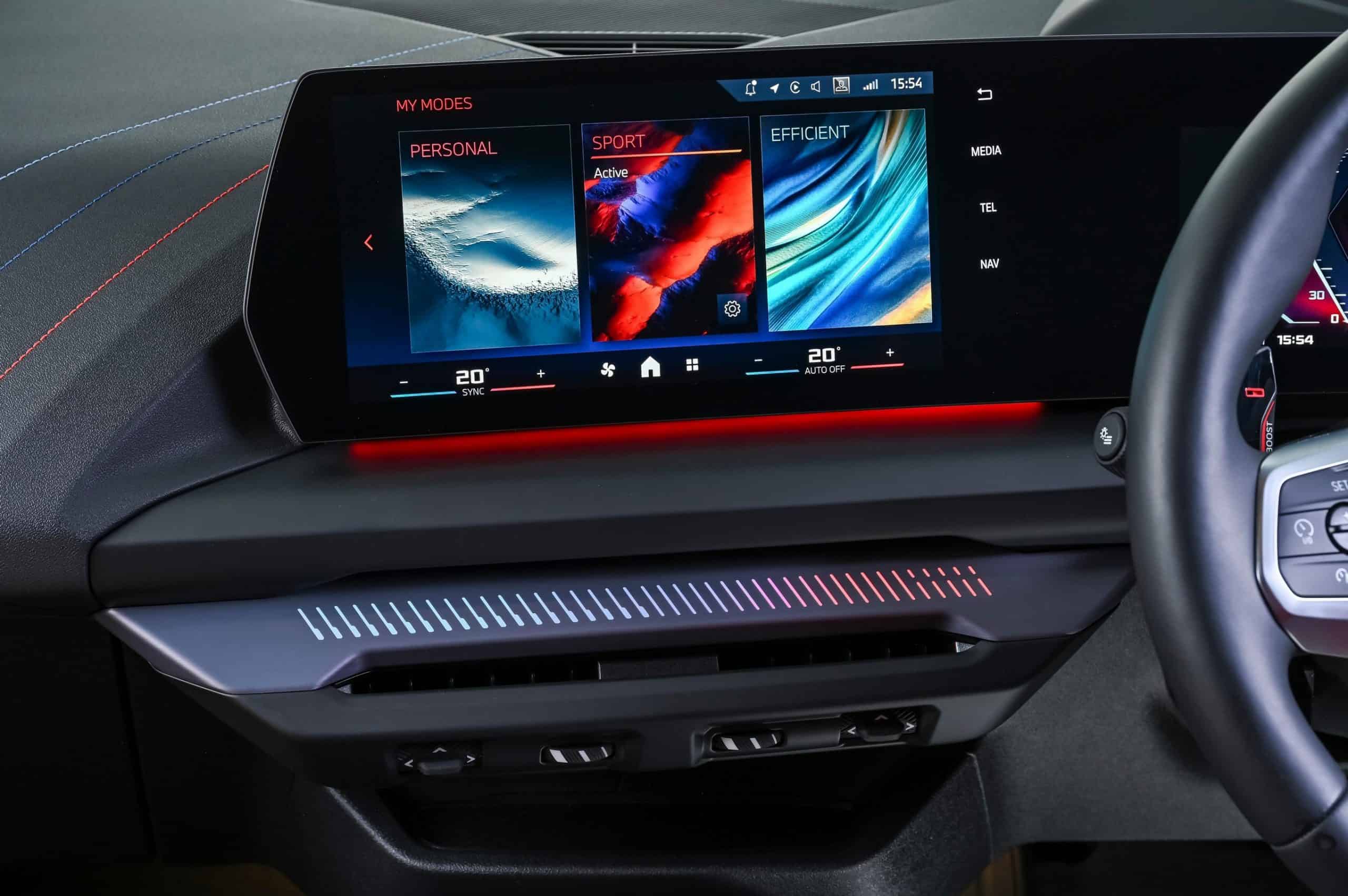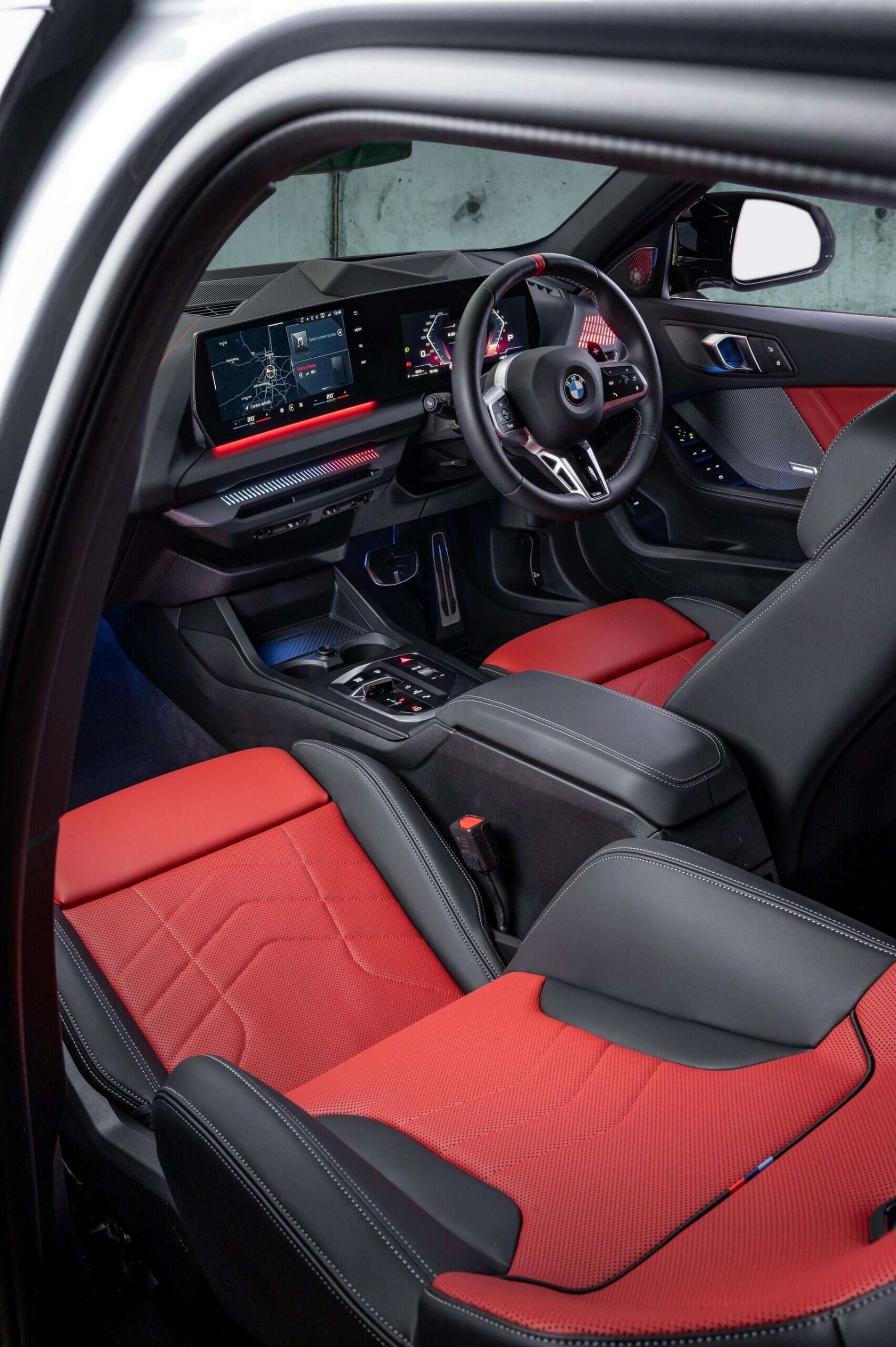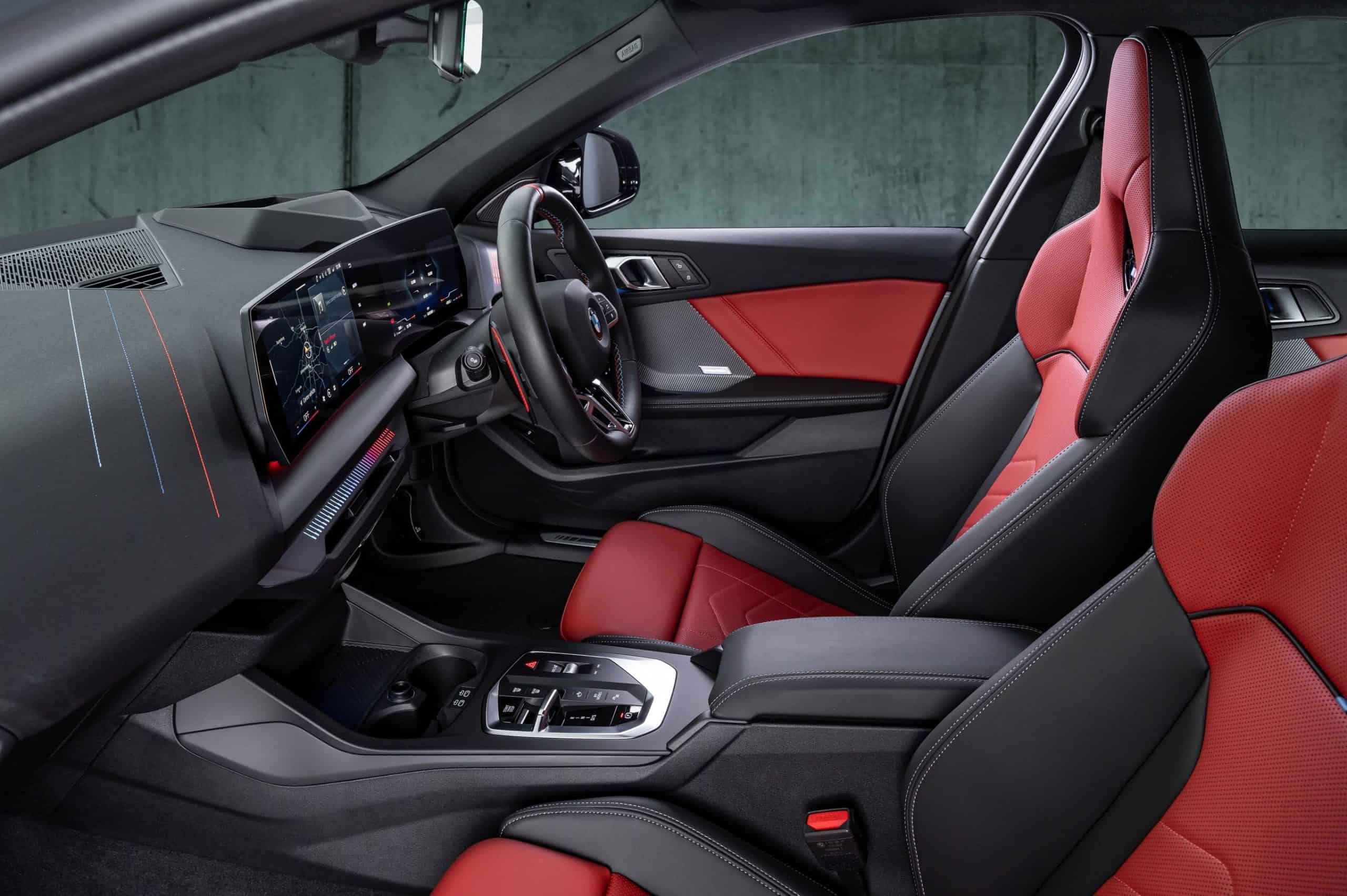 The M theme continues inside, where the body-hugging front seats feature an illuminated M logo in the integrated headrests, mirroring BMW’s full M models. Additionally, the iconic tri-color stitching appears on the dashboard and steering wheel, which also features a red 12 o’clock mark. The ambient lighting reflects the signature blue, violet, and red scheme.