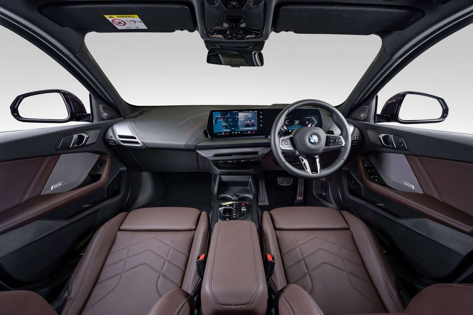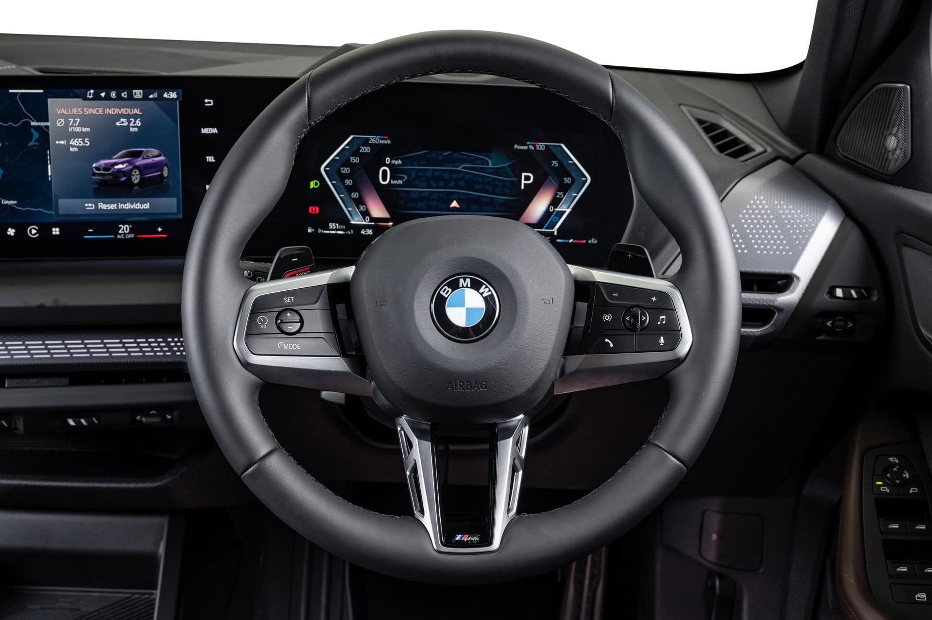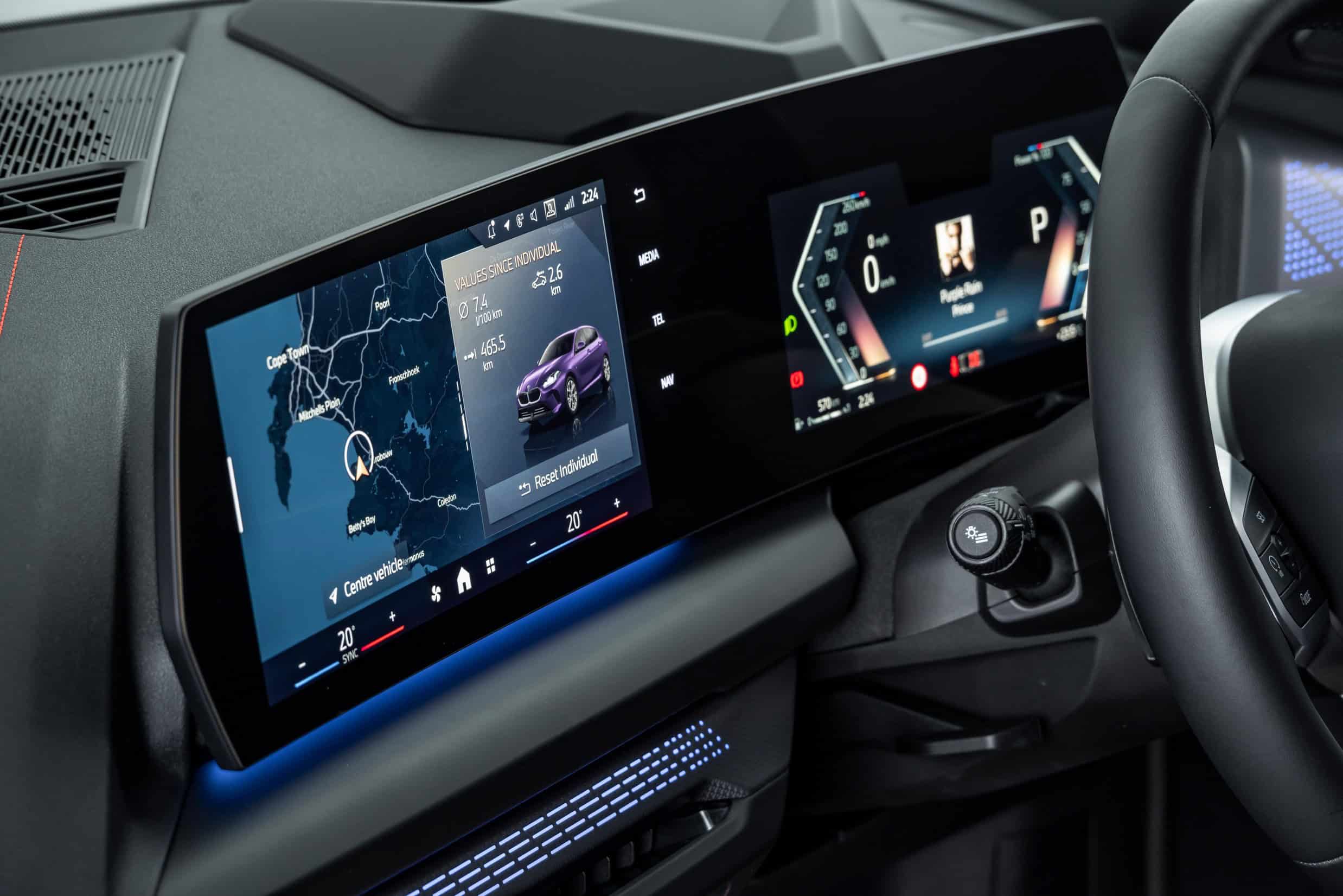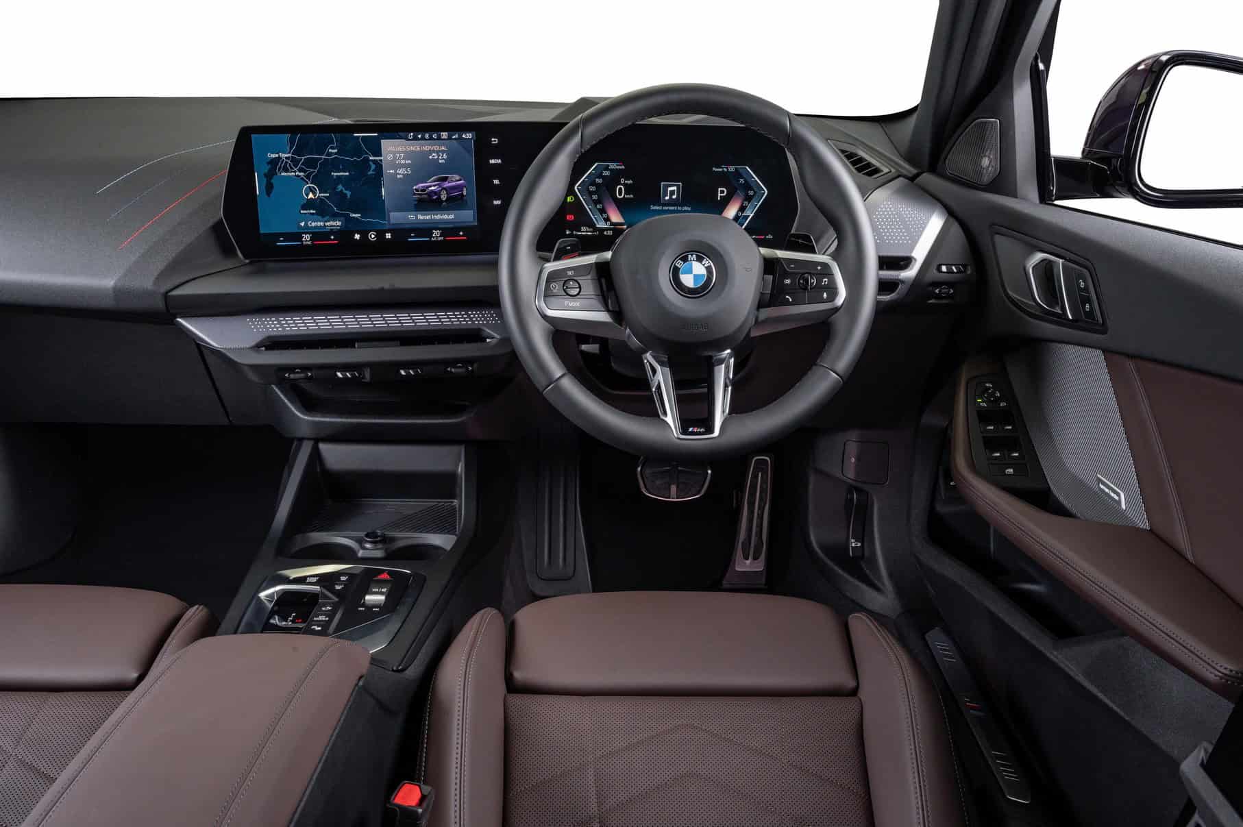 Inside, BMW South Africa highlighted the right-hand-drive 1 Series with perforated Veganza artificial leather in Mocha. The M Sport Package continues inside with tri-color stitching on the dashboard, a nod to BMW M’s signature colors. There’s even an M logo in the digital instrument cluster, even though this isn’t the M135, let alone a true M car.