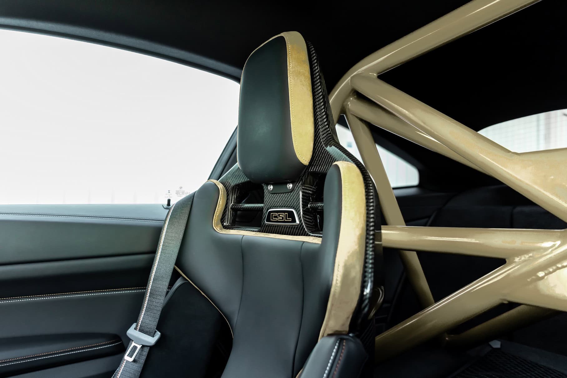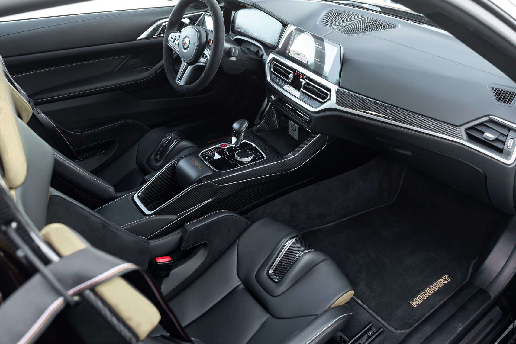 The long list of modifications includes height-adjustable coilover springs for sharper handling and more visual drama. Since this build is based on the CSL, Manhart had plenty of room in the rear cabin to install a roll cage. New floor mats and champagne trim round out the interior changes. Although not explicitly mentioned, the left air vent has been replaced by an auxiliary screen displaying key performance data.
