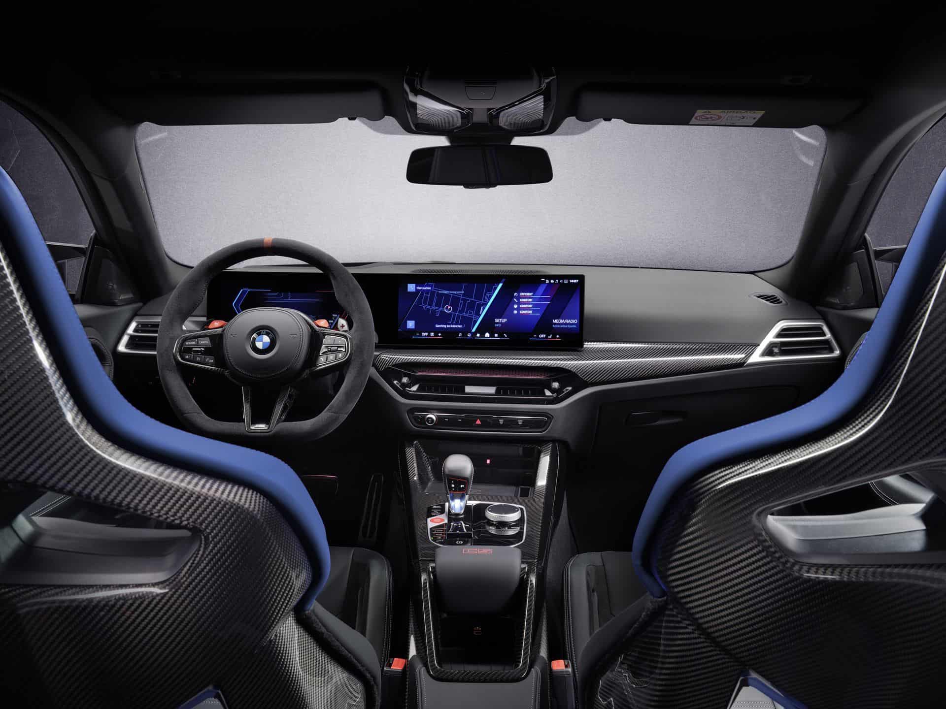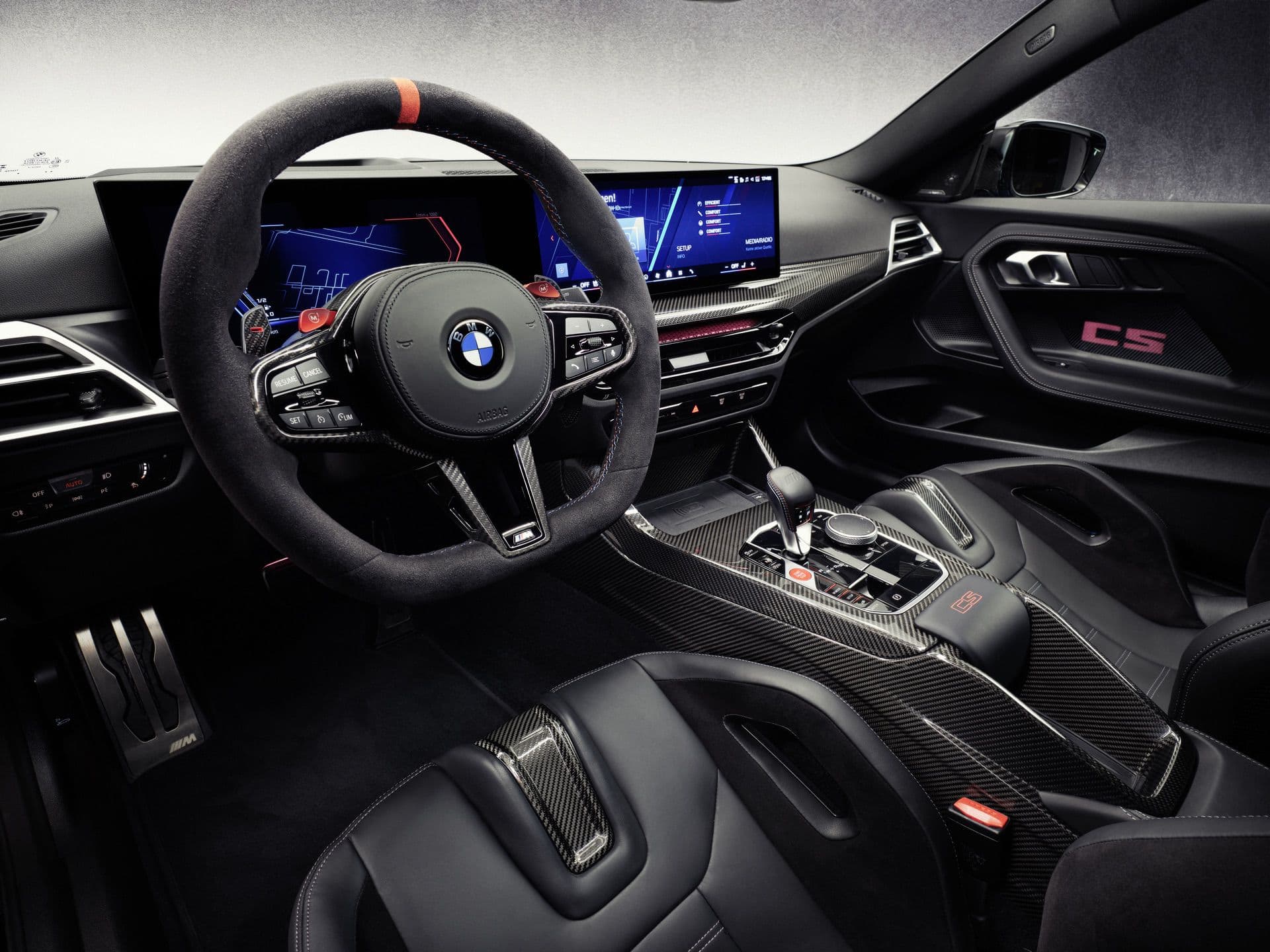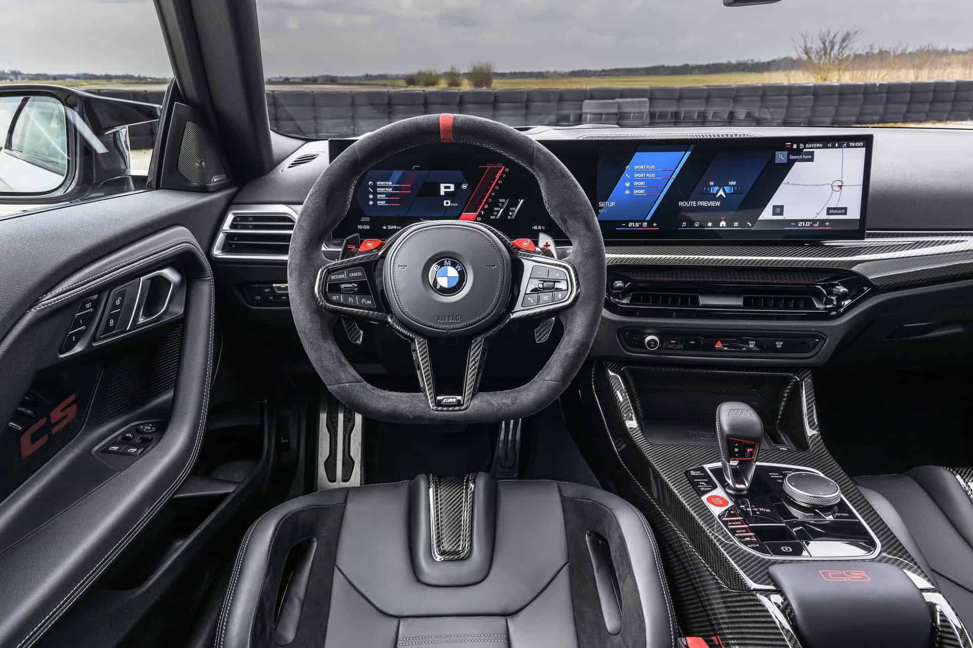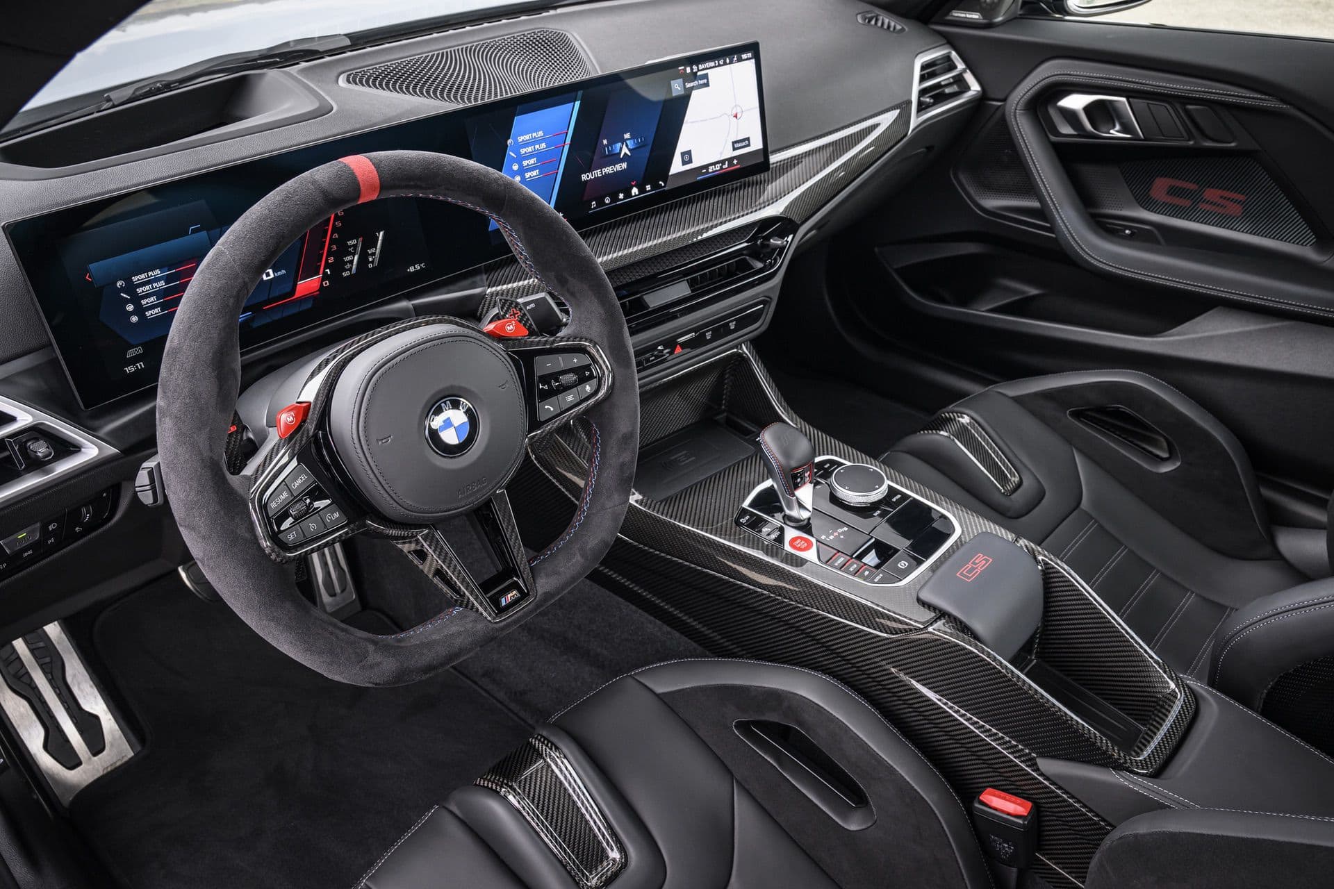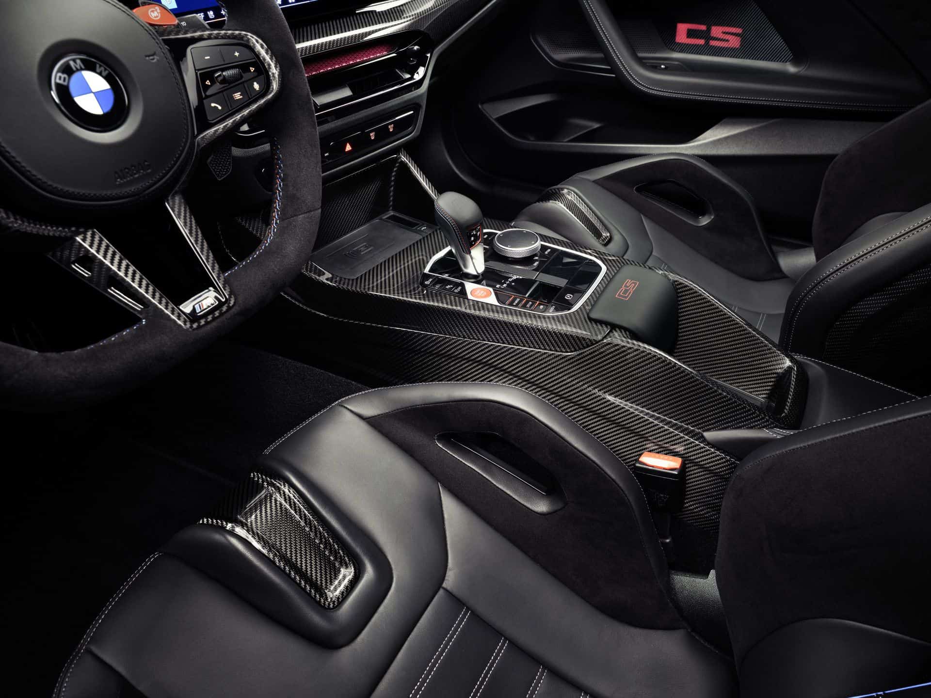 The Alcantara-wrapped, three-spoke M steering wheel has a flat bottom, gearshift paddles, a red 12 o’clock marker, and two M buttons for quick access to custom driving settings. Carbon-fiber trim runs across the dash and center console, where you’ll also find a red “CS” badge. Other touches include M seatbelts, door sills with an illuminated “CS” logo and red outline, and customizable ambient lighting in the door panels—turn it off to see the carbon weave underneath. The M Anthracite headliner completes the focused, driver-centered cabin.
