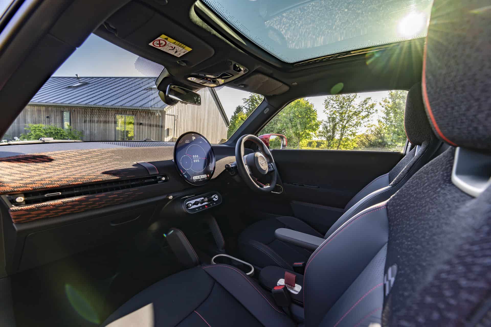 There’s a satisfying blend of cheeky design and premium tactility. Dashboard materials feature a chequered knit pattern, the steering wheel strap replaces a lower spoke, and there’s a playful use of red details throughout. However, the driving position in the J01 is slightly higher than the petrol JCW—noticeable and not universally liked among testers.