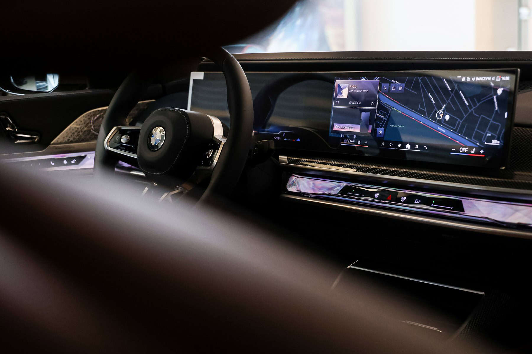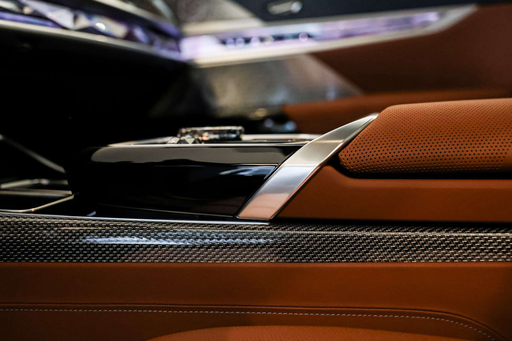 While BMW highlights the new paint job, the interior is also far from standard. This 740d is equipped with Tartufo Merino leather from the Individual catalog, paired with carbon fiber trim. It also features the CraftedClarity package, which is BMW’s marketing term for a crystal-like finish on elements such as the iDrive rotary knob and gear selector.