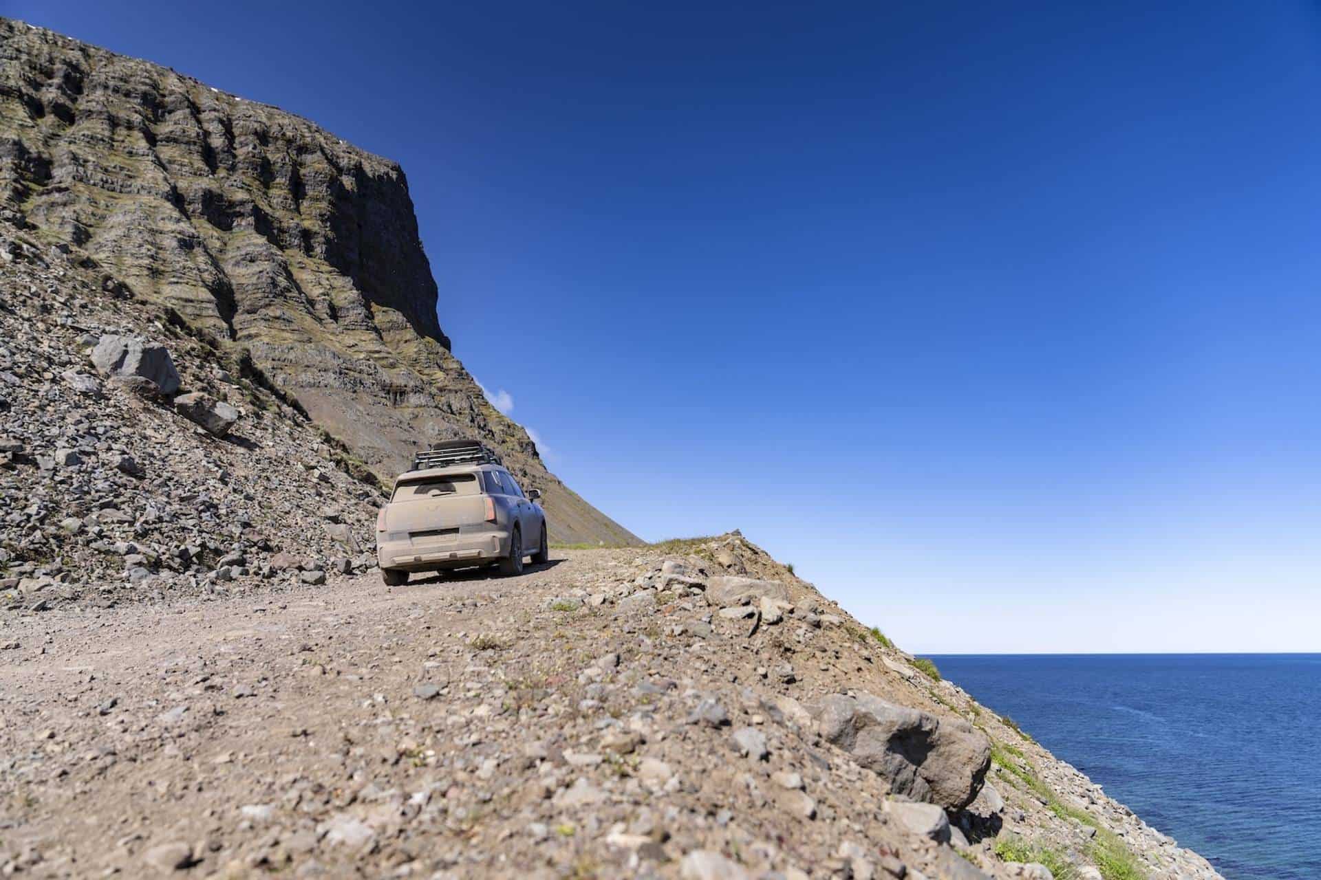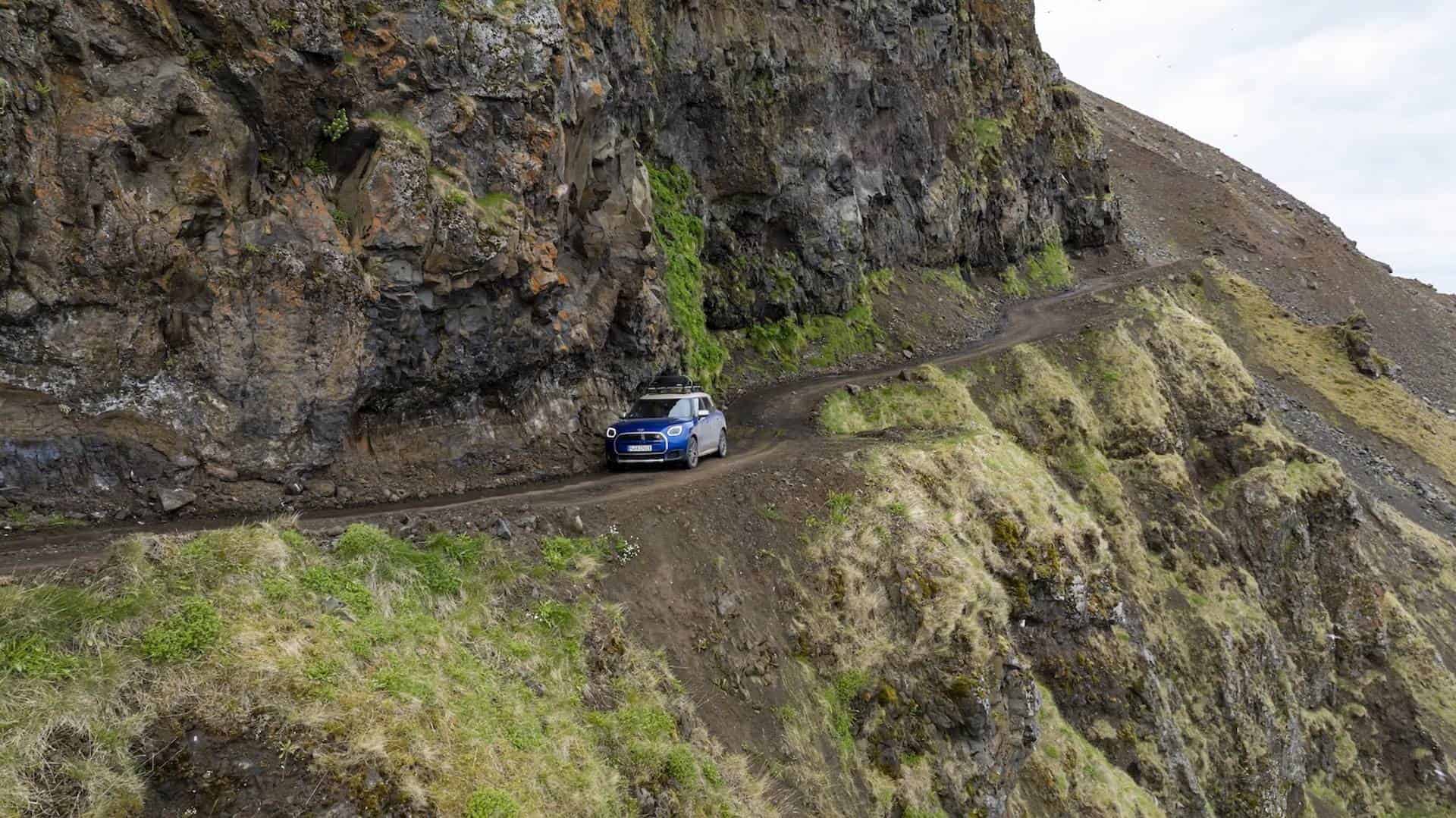 At 12:30 a.m., the increasingly dirty Countryman reaches the Flokalundur Hotel in bright sunshine, before setting off on the demanding final leg of Route 622 at 5 a.m. the next morning – one of the most challenging routes in the Westfjords, with a particularly spectacular scree passage by the water that can only be negotiated at low tide. While some adventure guides had sneered at the choice of vehicle and its off-road equipment when planning the tour, they were proven wrong the next day.