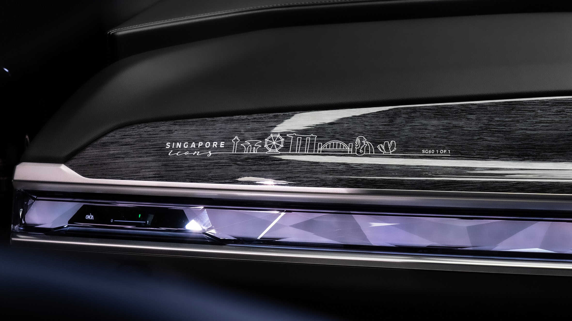 From what we can spot in these teaser images, the “Singapore Icons” motif will adorn the Hofmeister kink and headrests. Denoting the model’s exclusivity is an “SG601 of 1” logo etched into the wood trim on the dashboard, where we also notice some of the most famous landmarks. The electric 7 Series appears to have a bold combination of colors, featuring burgundy Individual paint and white leather.