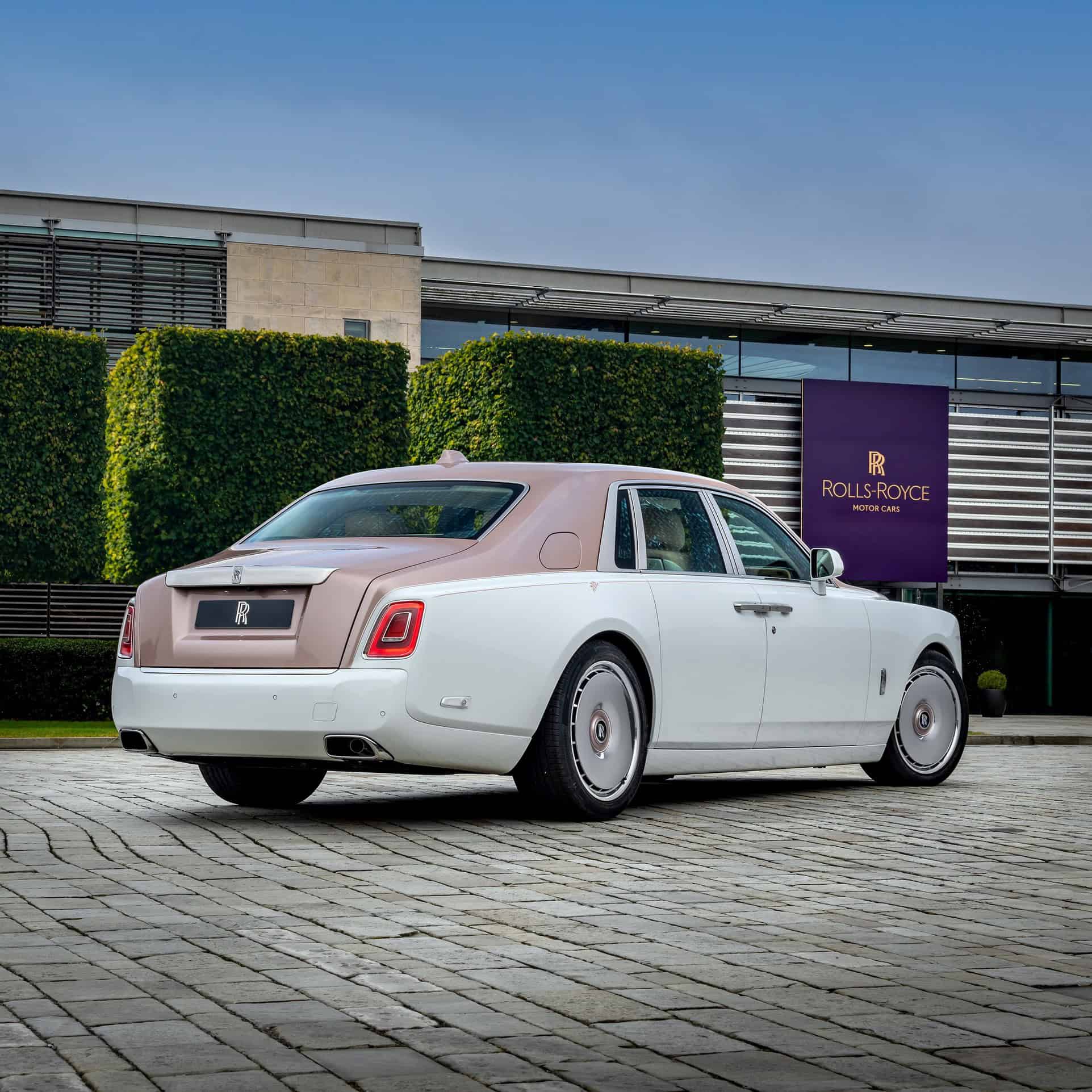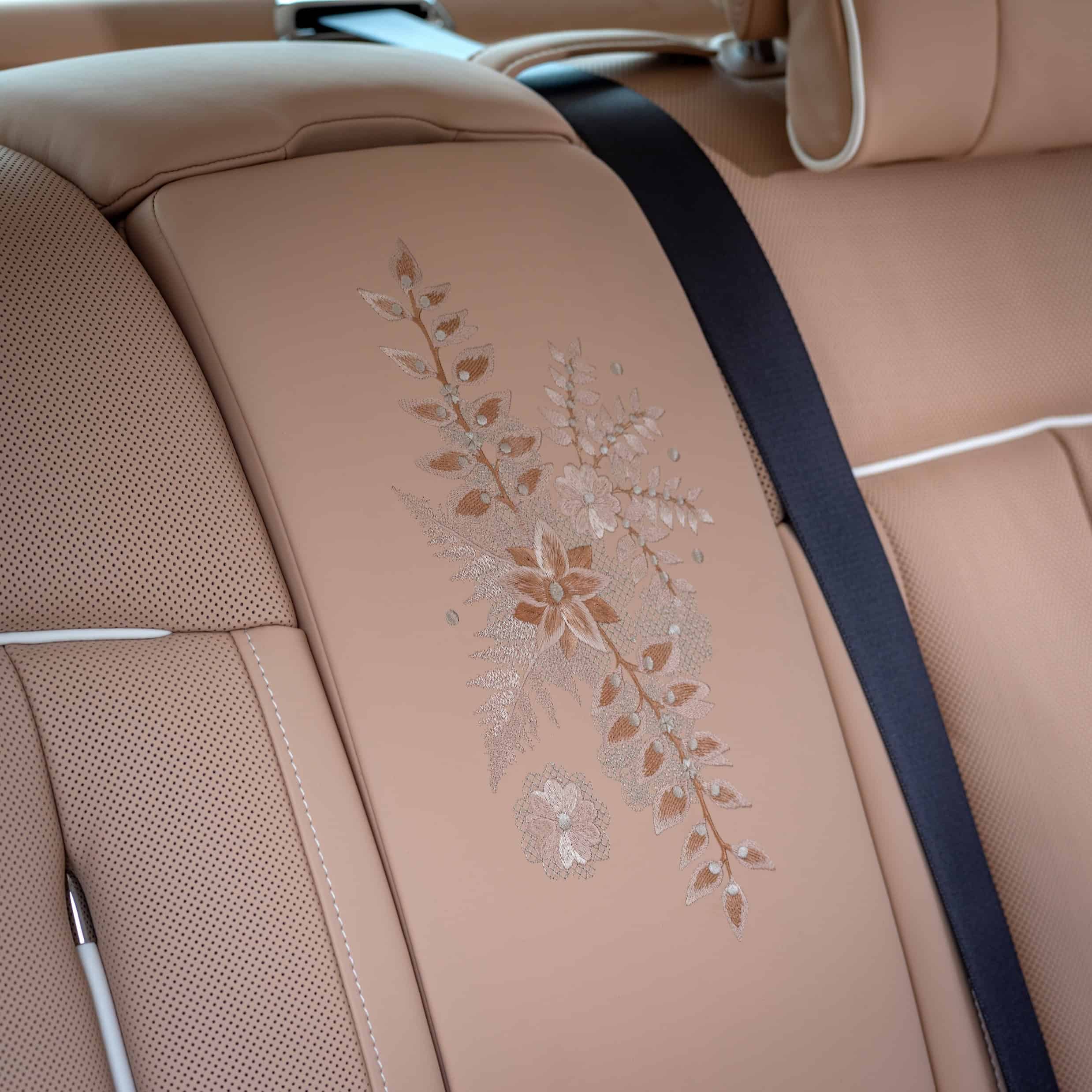 Rolls-Royce also has a special name for the area between the two rear seats; it’s called the “Waterfall,” and for this Phantom, it continues the floral theme. Another 70,000 stitches were required for the embroidery on the rear center armrest. To ensure the speaker grilles matched the cabin’s theme, the specialists in Goodwood finished them in Rose Gold. Elsewhere, the interior pairs Sunrise and Grace White leathers with a Piano White veneer, Rose Gold treadplates, and “RR” logos embroidered onto all four headrests.