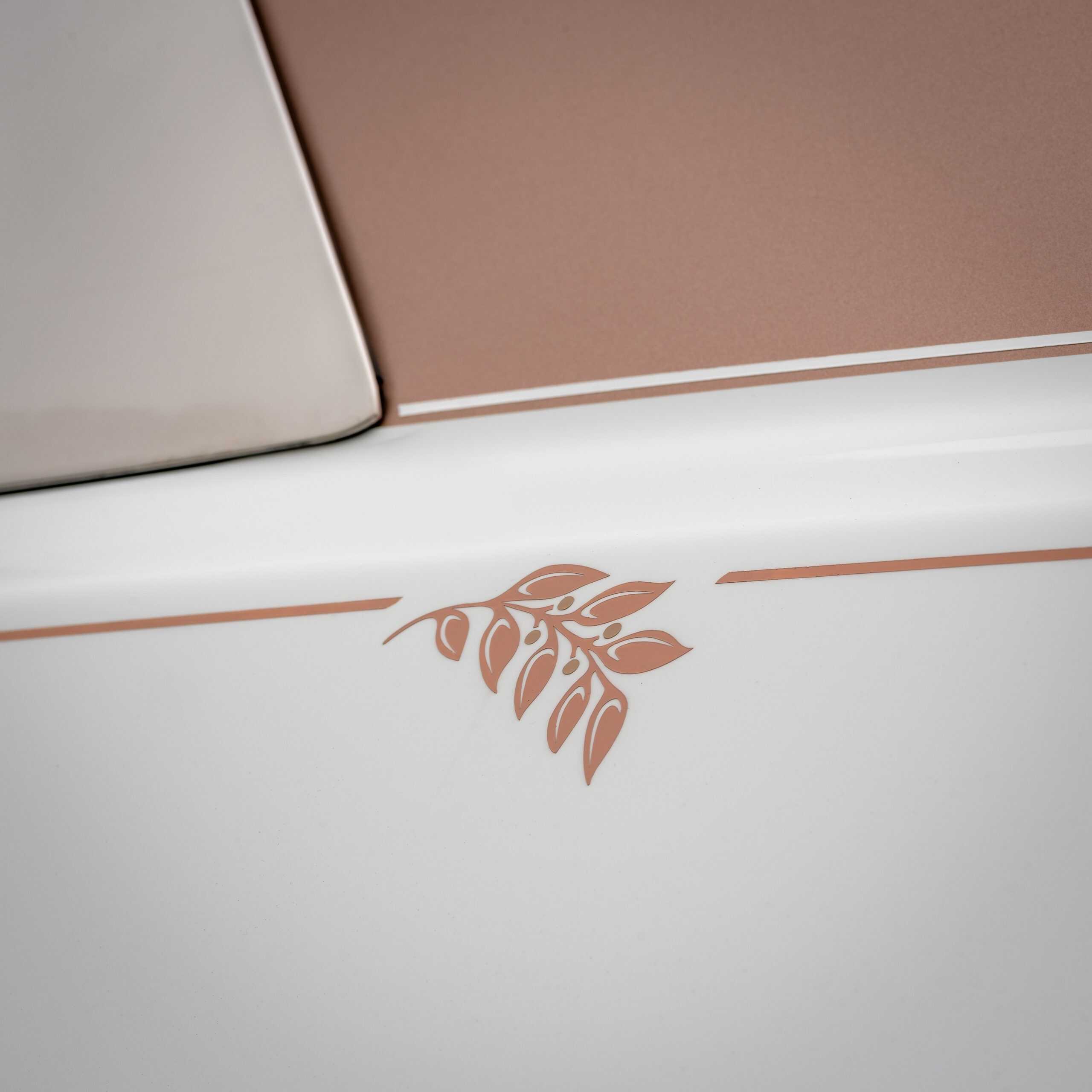 The exterior is just as elaborate. The double coachline features a hand-painted leafy branch to make the two-tone body stand out even more. The lower portion wears Crystal over Arctic White, while the upper is finished in Crystal over Palais Nemasker Dawn. It’s a color combination exclusive to this client and unavailable to others.