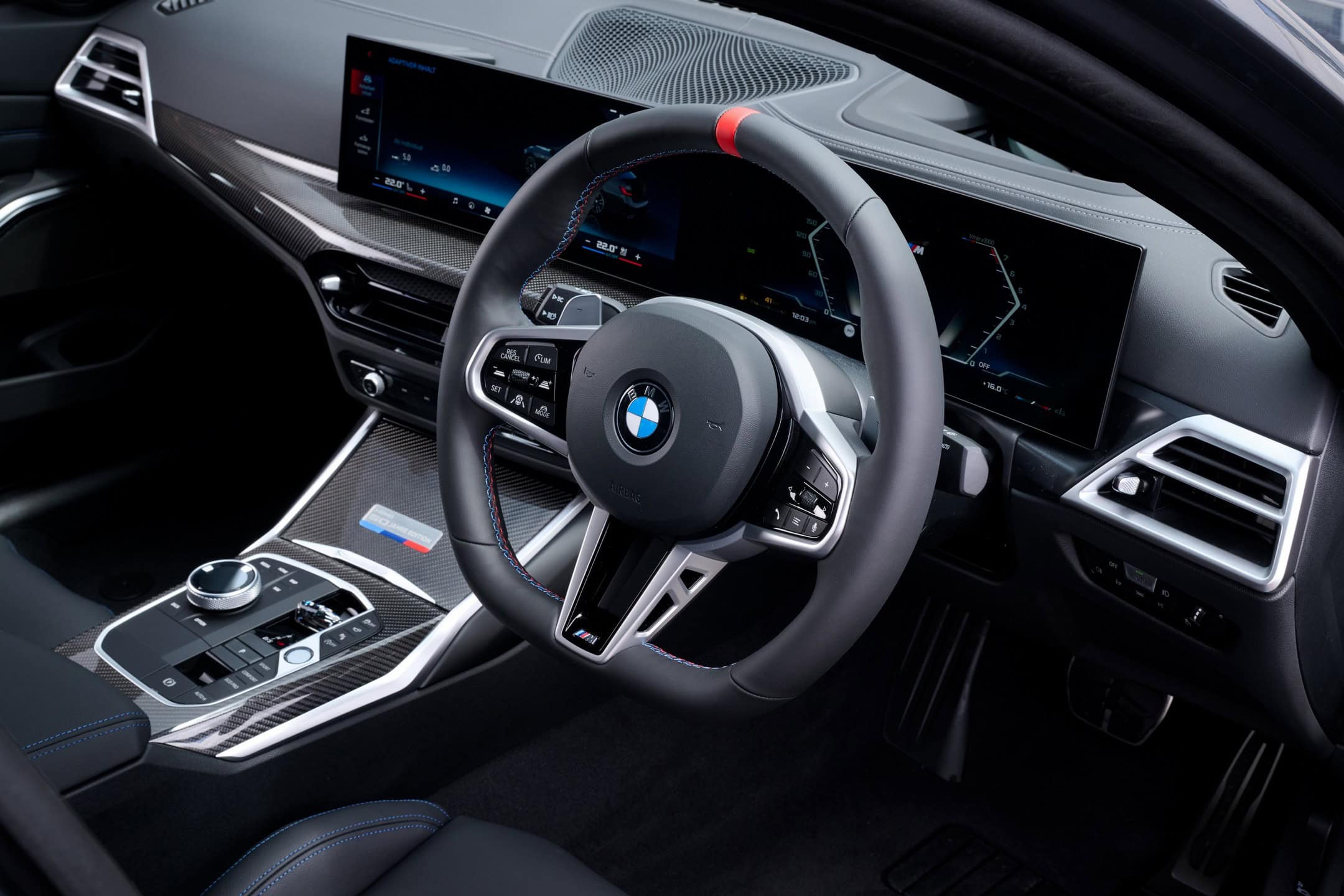 There isn’t much to report inside, but BMW is adding a touch of exclusivity with a special plaque. A metallic “3 Series 50 Jahre Edition” badge with a colored M motif adorns the center console lid. Carbon fiber dashboard trim and M-themed seatbelts are also included in the package, but these features can be found on a regular M340i as well.