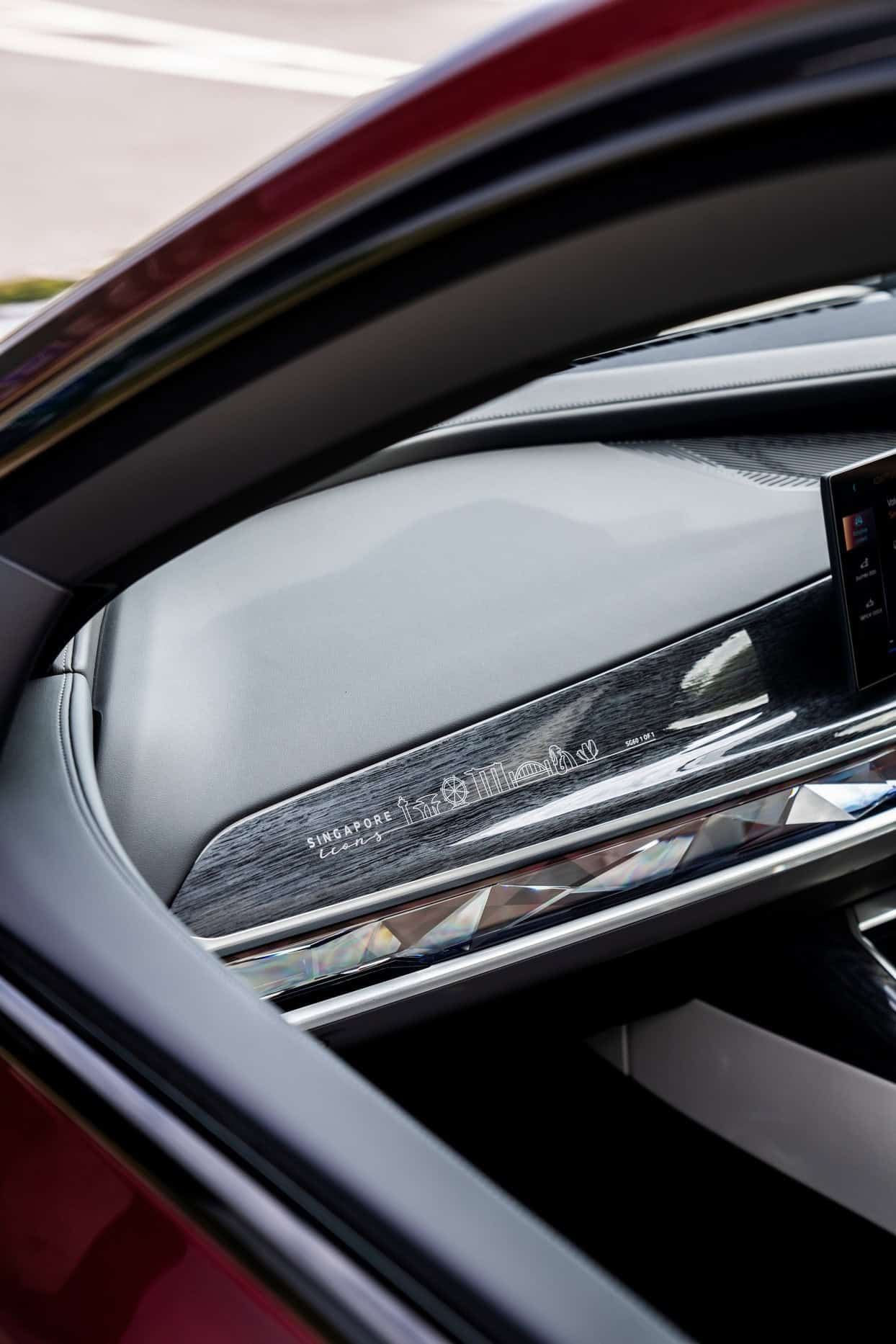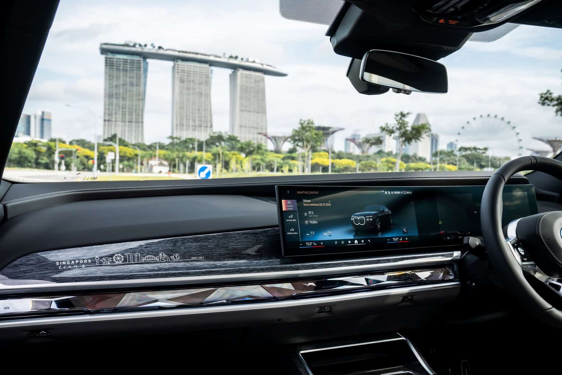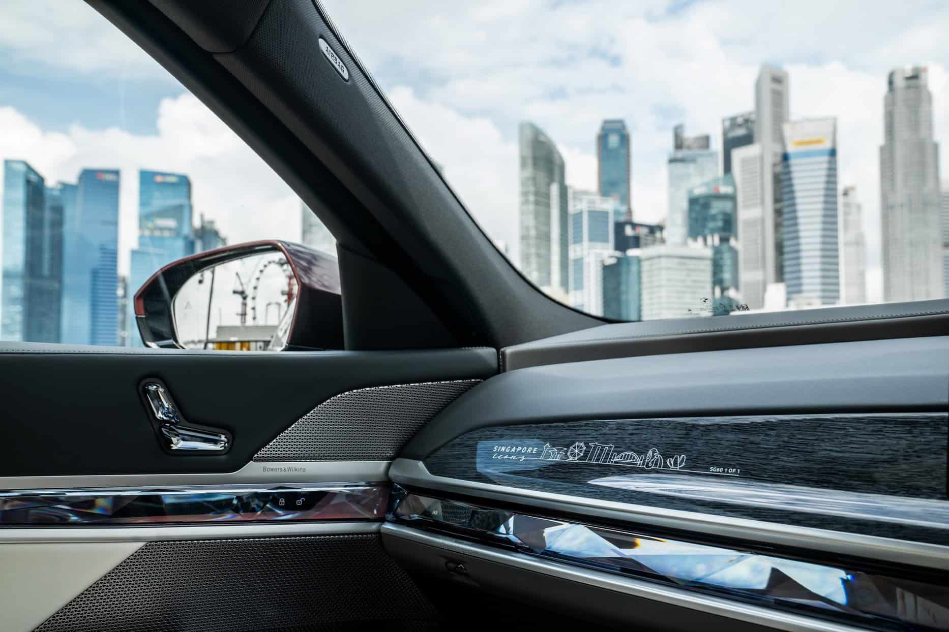 Inside, the owner opted for Merino leather upholstery in Smoke White, with “Singapore Icons” stitched in Alaska Grey into all four headrests. What truly sets the cabin apart from any other G70 7 Series is what’s on top of the dashboard’s oak grey metallic trim, finished with a clear lacquer coat. There’s a metallic inlay measuring 25.7 centimeters, crafted from a single, laser-cut piece of metal.