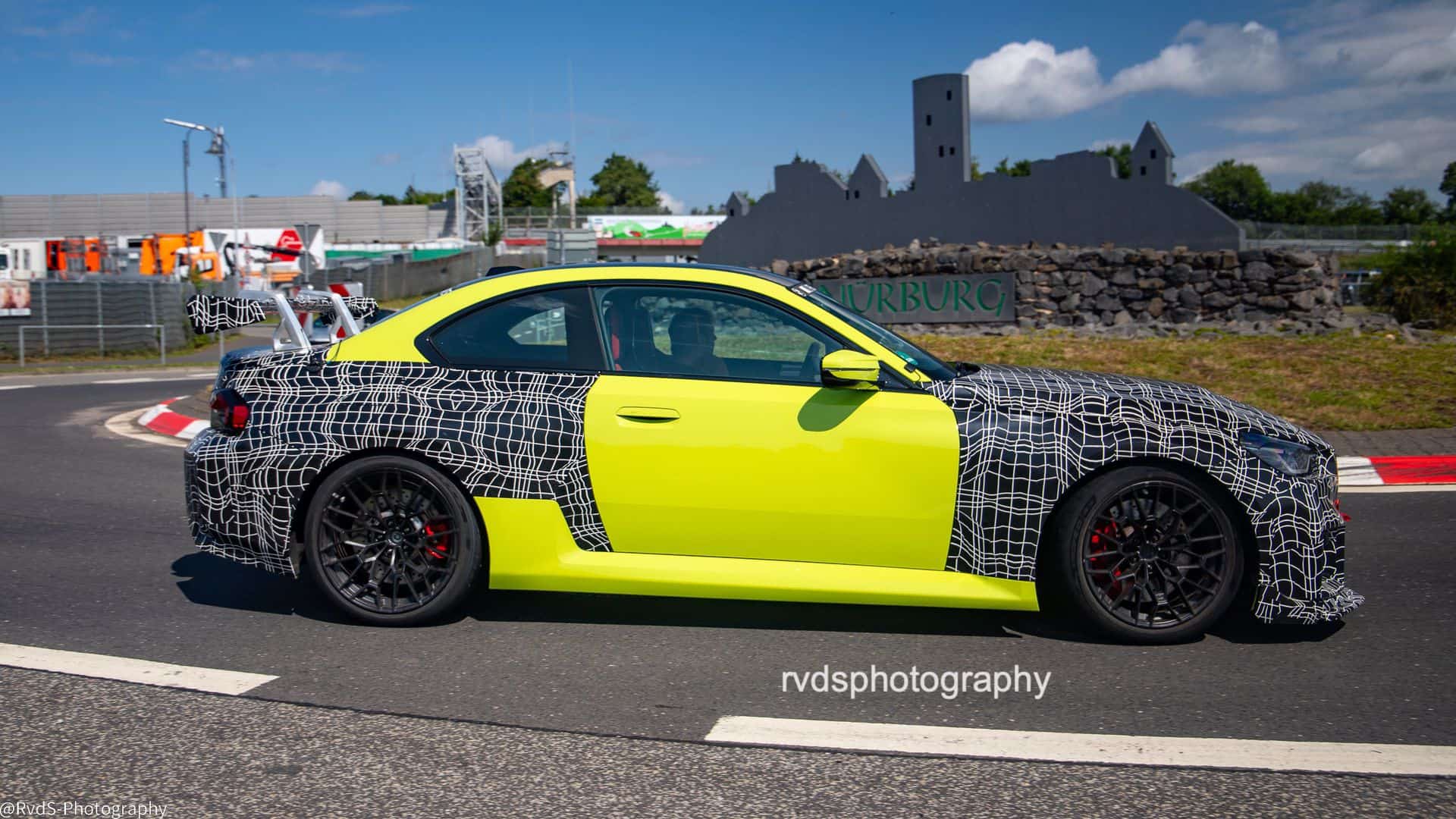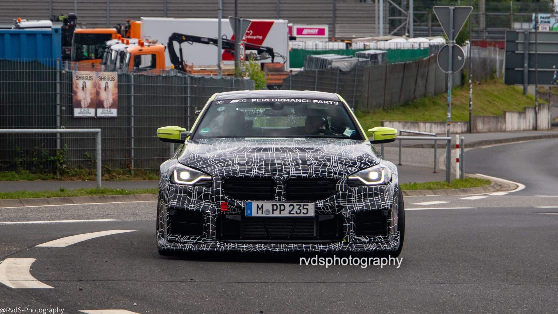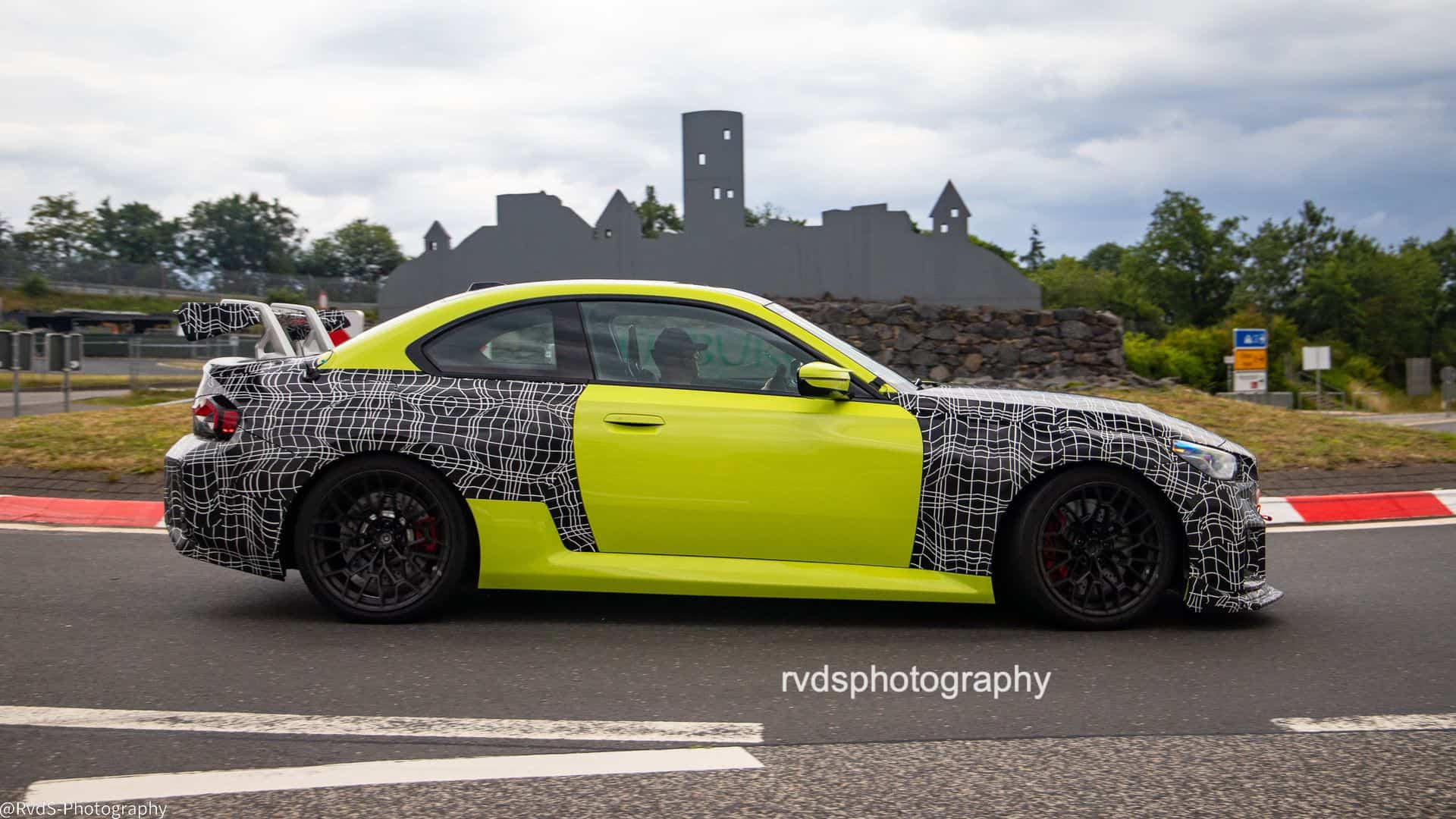 Painted in São Paulo Yellow and hiding behind layers of camouflage, the test car gives away a few things. Most obvious is the large fixed rear wing—clearly not for show. The front bumper has been reworked too, with what appear to be wider air intakes. Even the M2 badge on the kidney grille is taped over, which usually signals development changes still in progress.