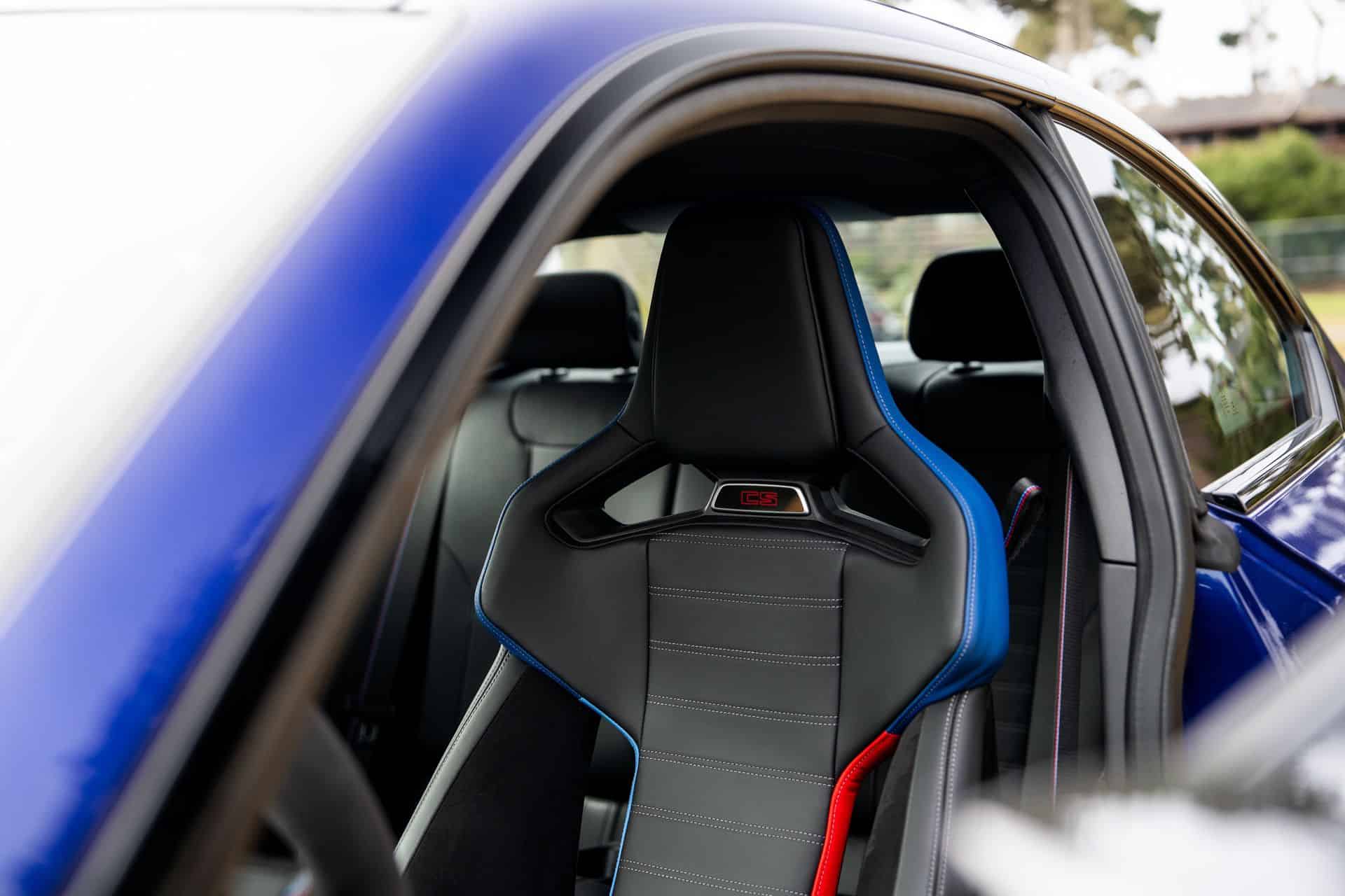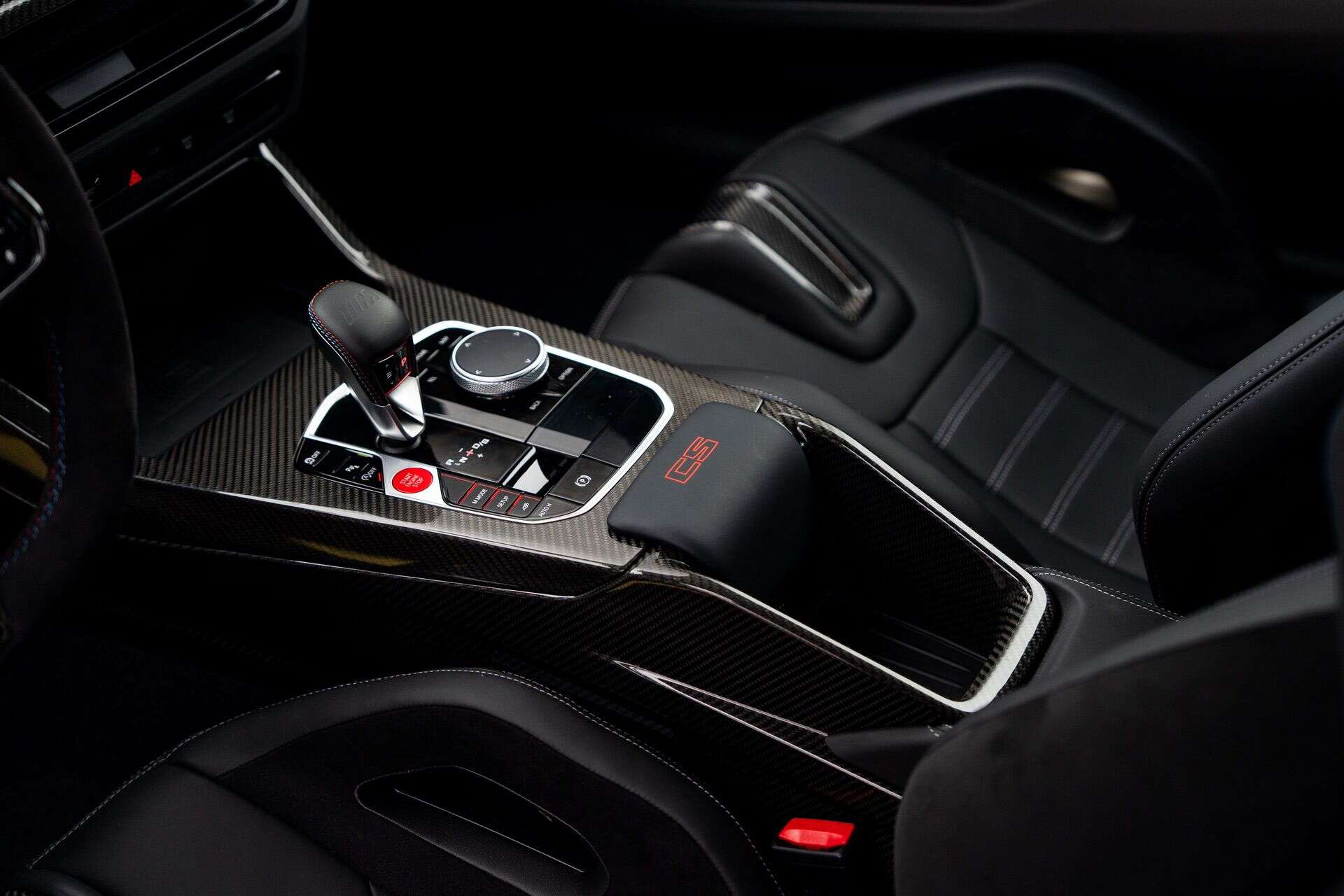 Inside, changes are perhaps less immediately obvious but no less important. Weight savings initiatives include losing the center armrest and installing carbon fiber bucket seats, the latter of which is an option for regular M2 orders. Carbon fiber decorates the cabin, accented with red “CS” touches everywhere you look. A carbon fiber center console sheds additional weight and is exclusive to CS-badged cars. An Alcantara-wrapped steering wheel pulls it all together.