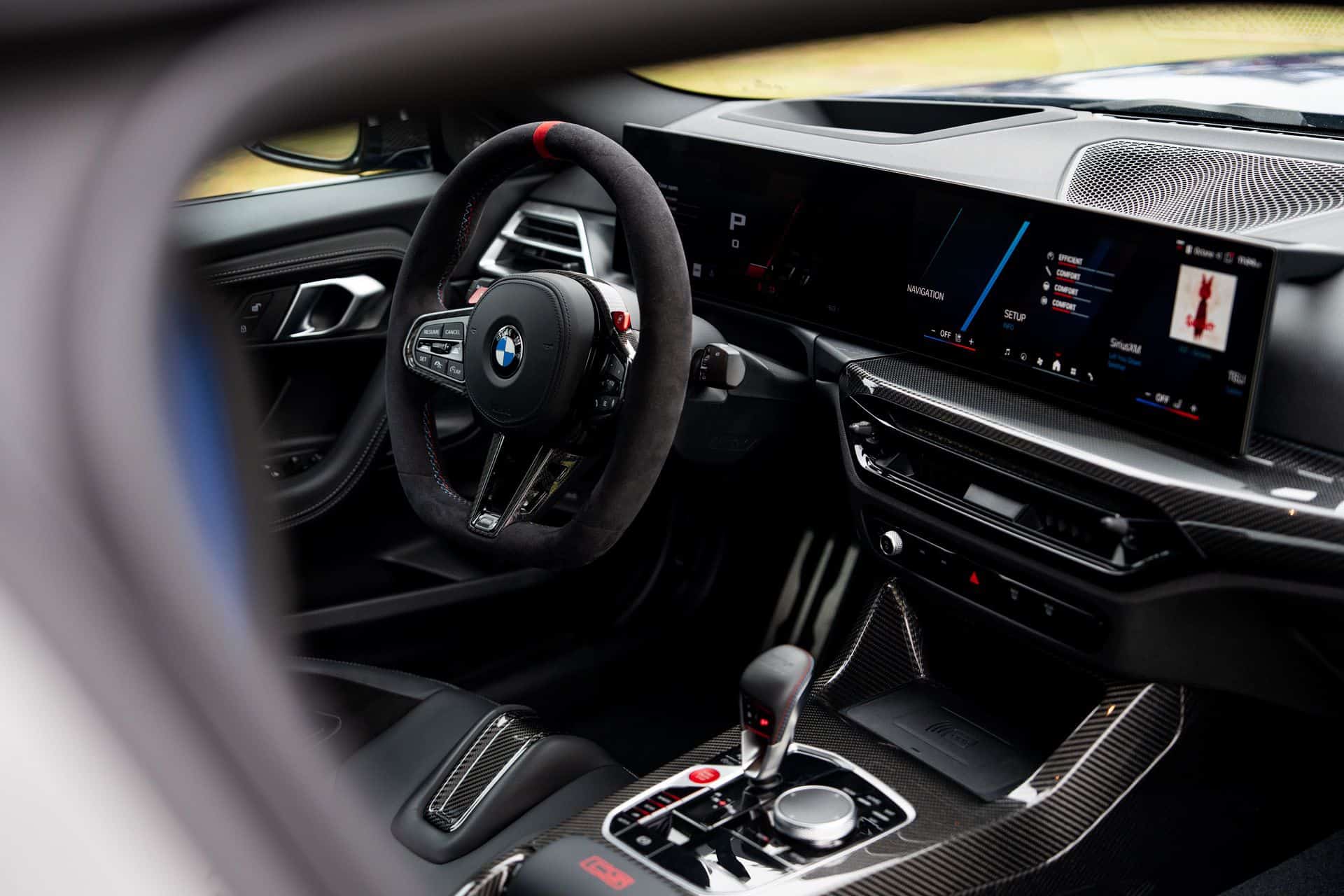 Inside, the differences may be subtler at first glance compared to the regular M2, but they’re just as significant. BMW’s weight-saving strategy is clear: the center armrest is gone, and carbon fiber bucket seats—optional on the standard M2—are fitted to keep weight down while boosting track-day support. The cabin is finished with generous carbon fiber trim, highlighted by bold red “CS” accents that mark this model out. A lightweight carbon fiber center console, exclusive to the CS, further reduces mass, while an Alcantara-wrapped steering wheel completes the driver-focused cabin.