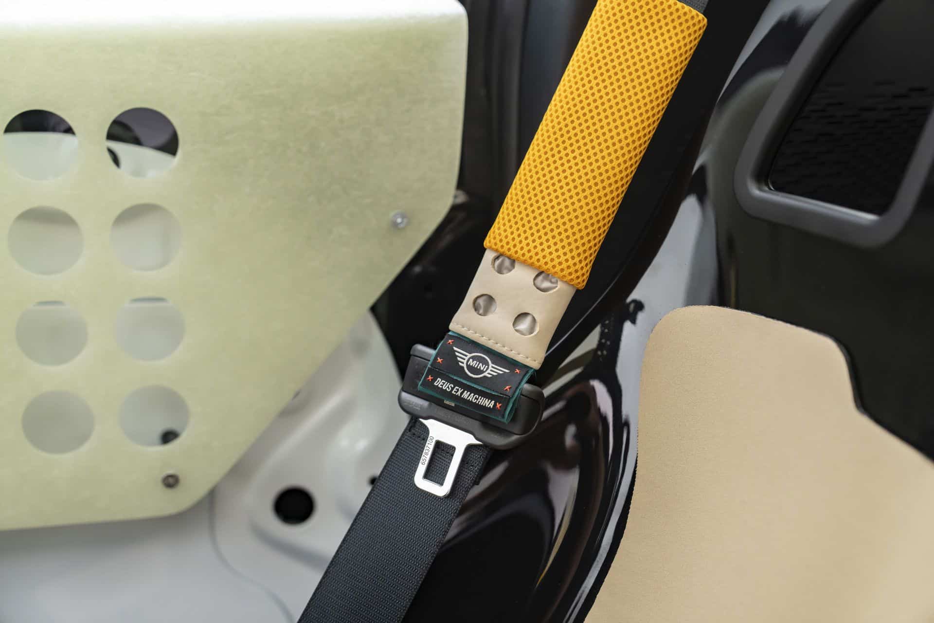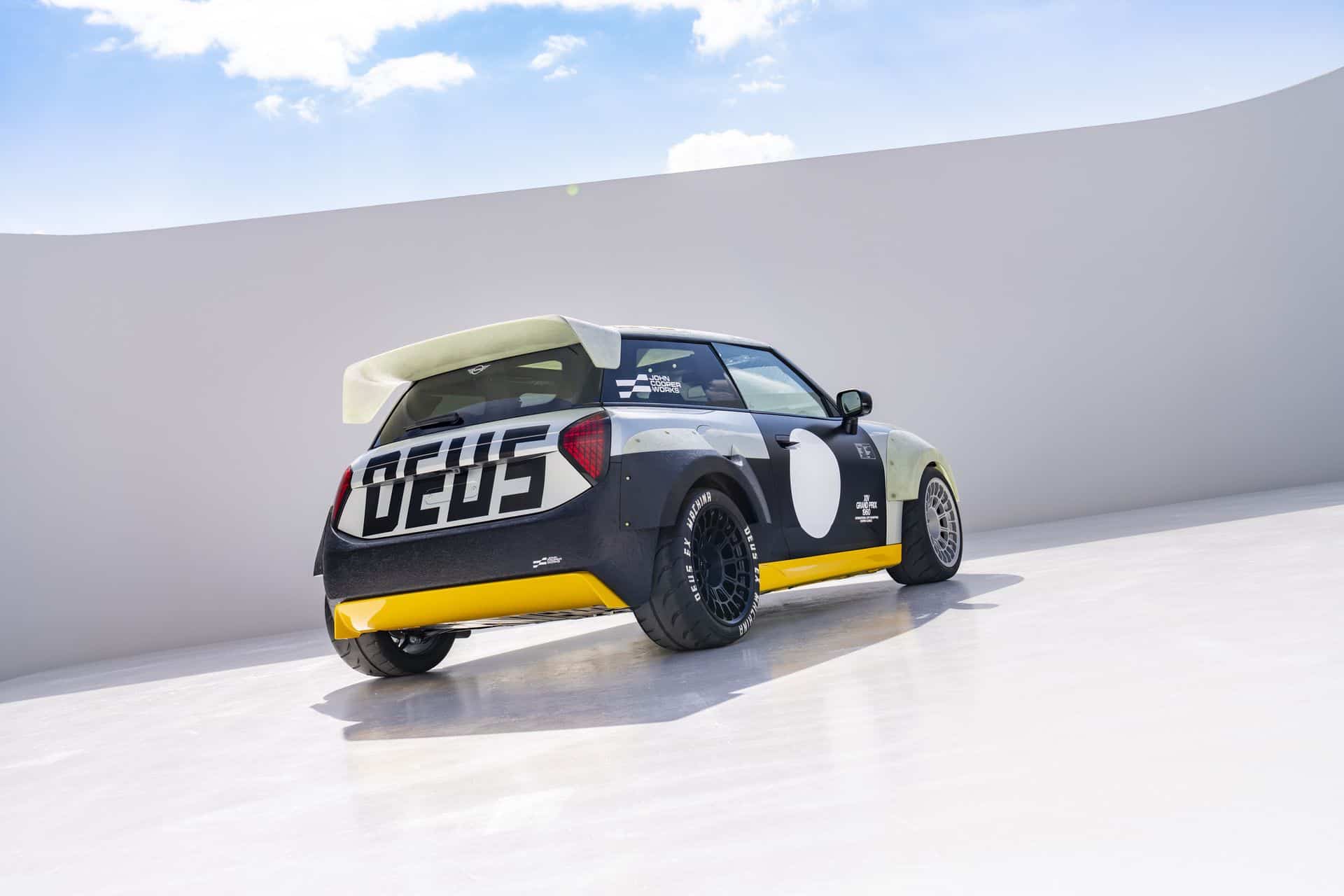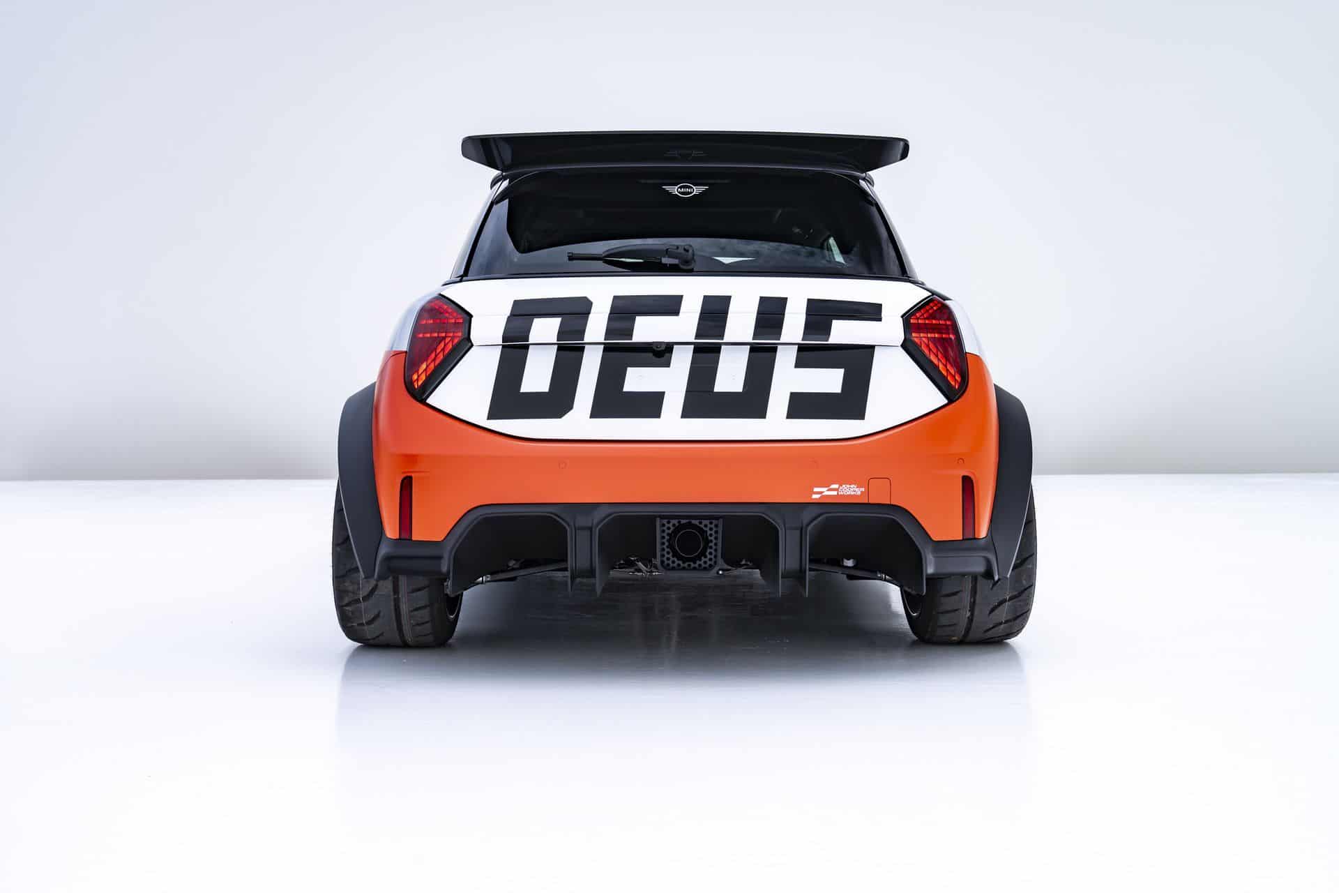 The cabin doubles down on motorsport theatrics: an exposed roll cage, oversized hydraulic handbrake lever, and visible seams emphasize raw mechanics over polish. The press release calls it a celebration of “authentic functionality,” with Deus logos, hand-finished details, and a “beauty of imperfection” approach that contrasts MINI’s usual gloss .