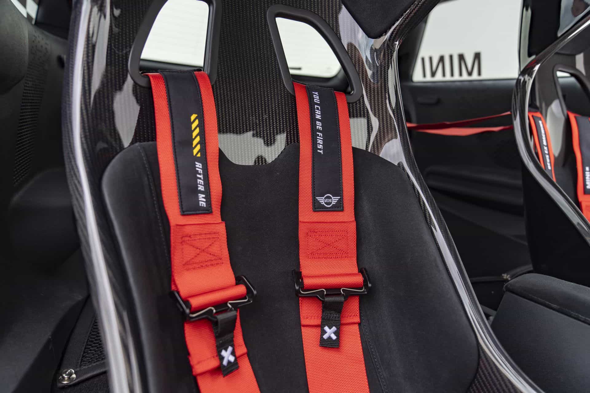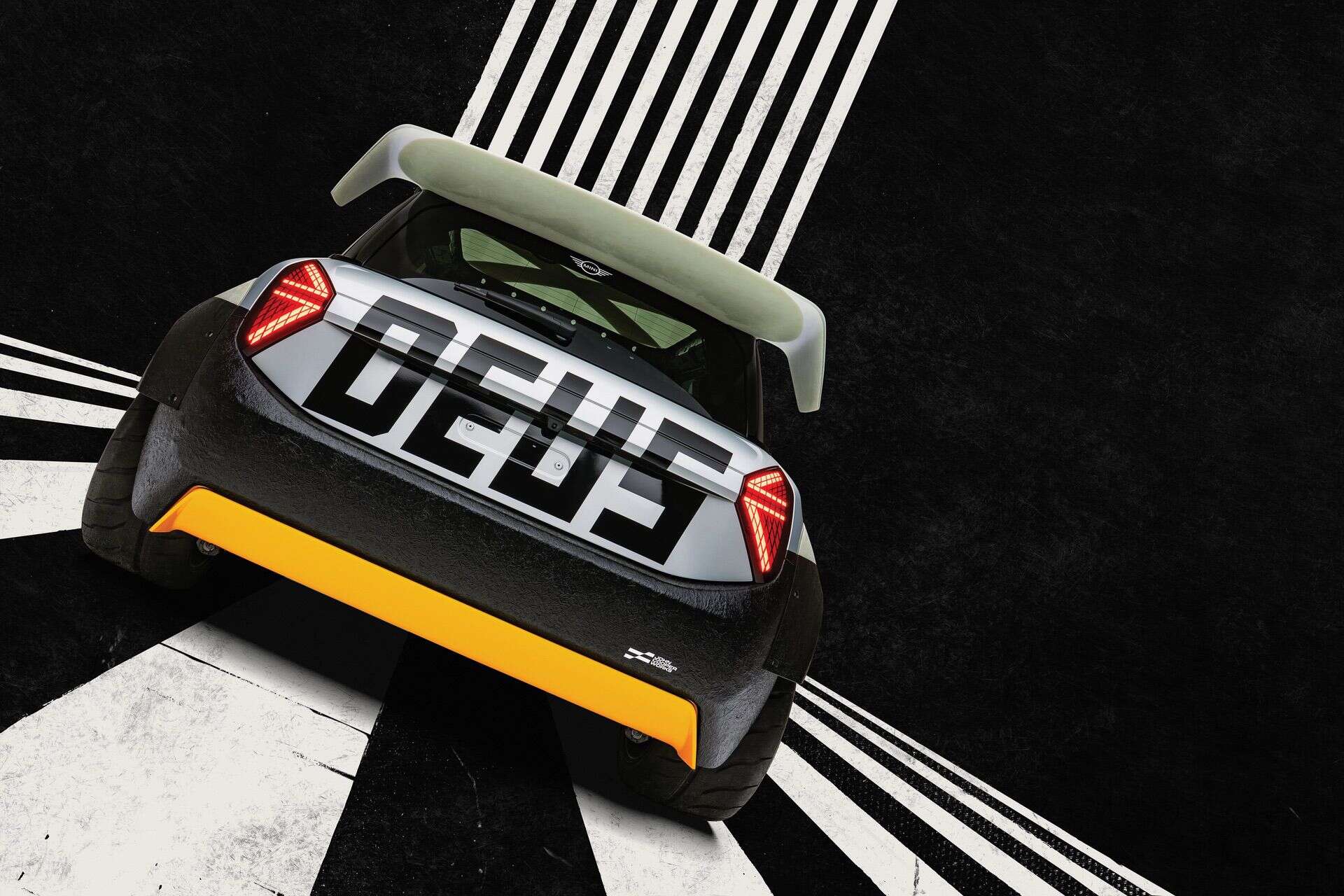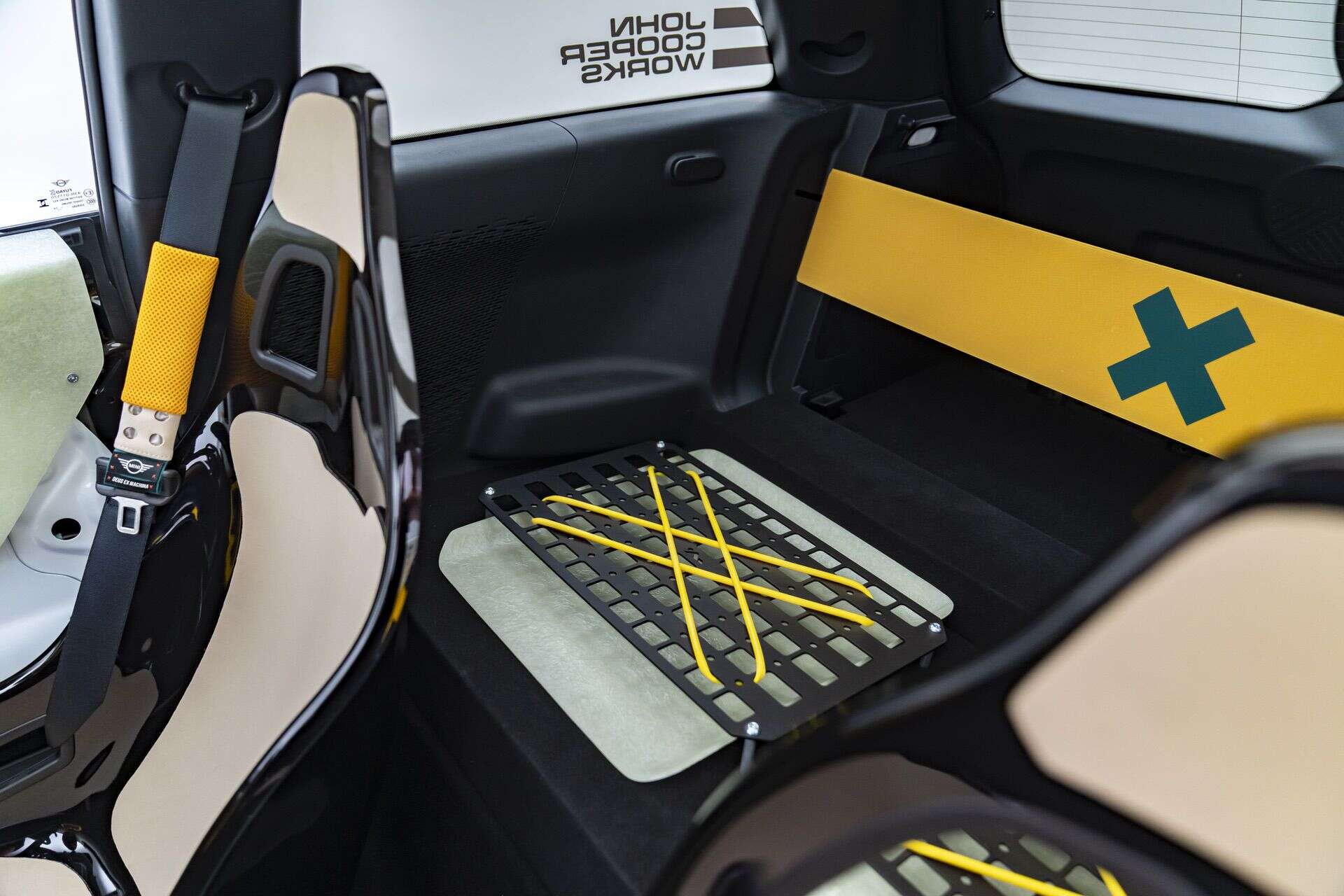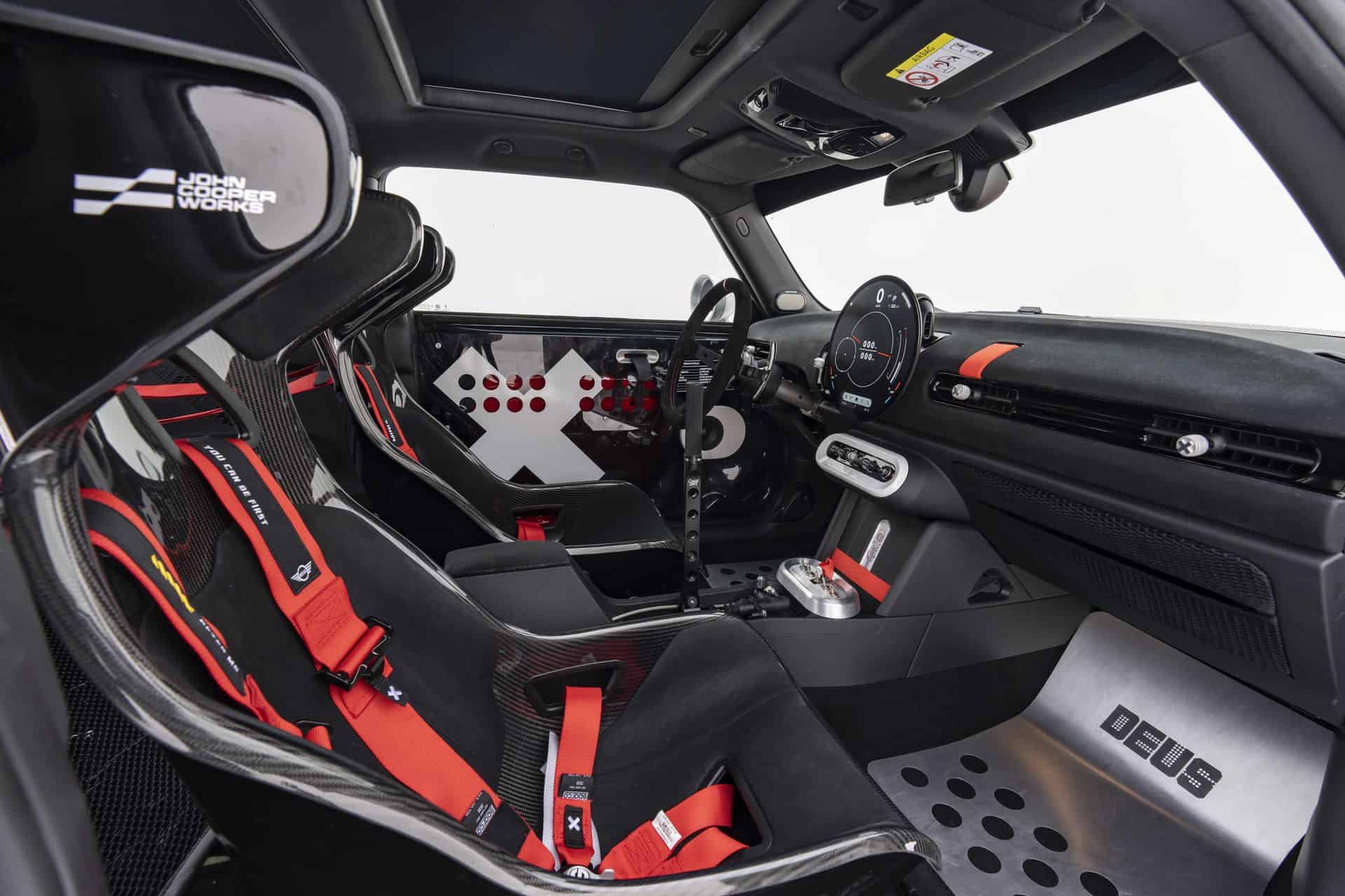 The cabin doubles down on motorsport theatrics: an exposed roll cage, oversized hydraulic handbrake lever, and visible seams emphasize raw mechanics over polish. The press release calls it a celebration of “authentic functionality,” with Deus logos, hand-finished details, and a “beauty of imperfection” approach that contrasts MINI’s usual gloss .