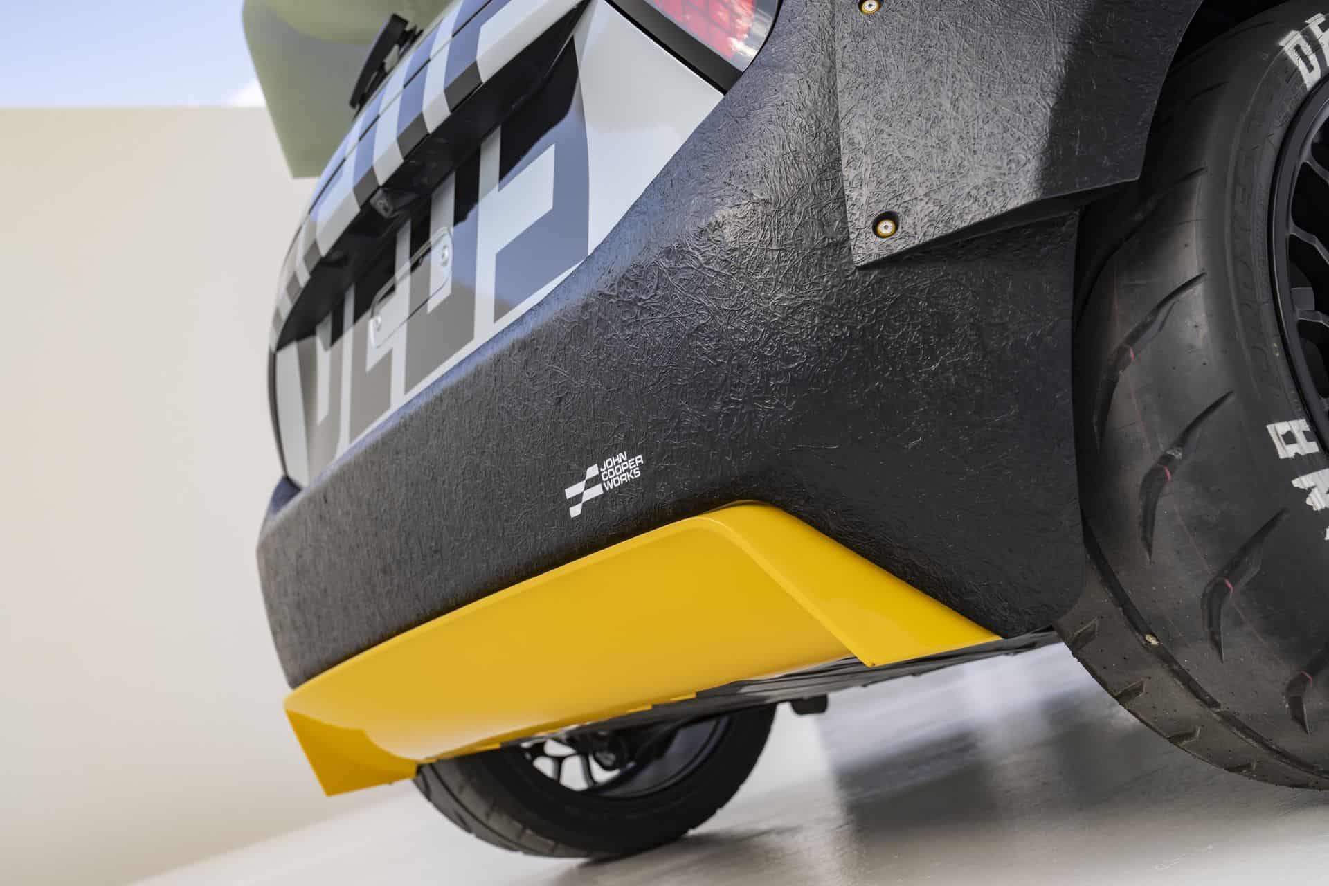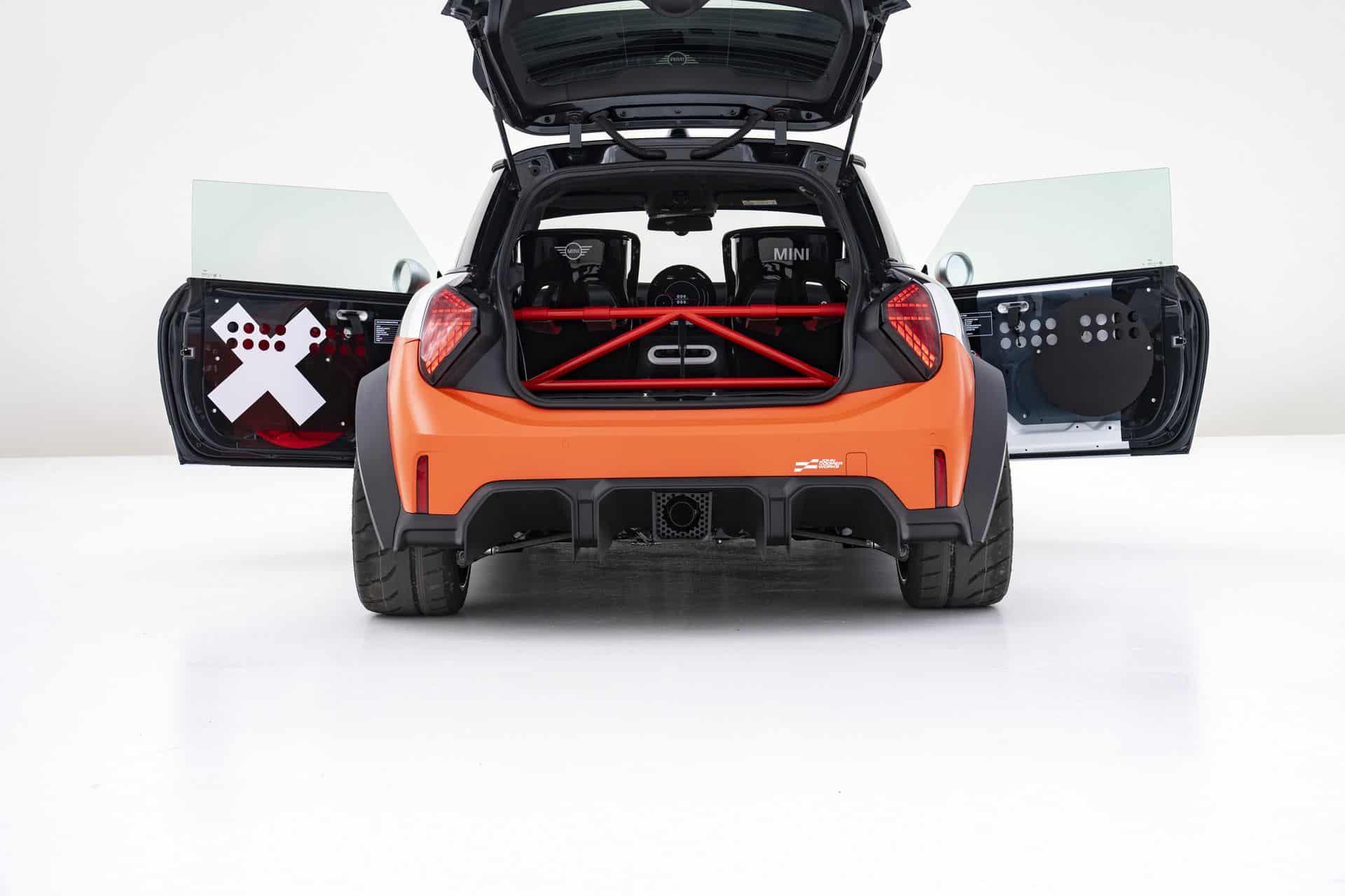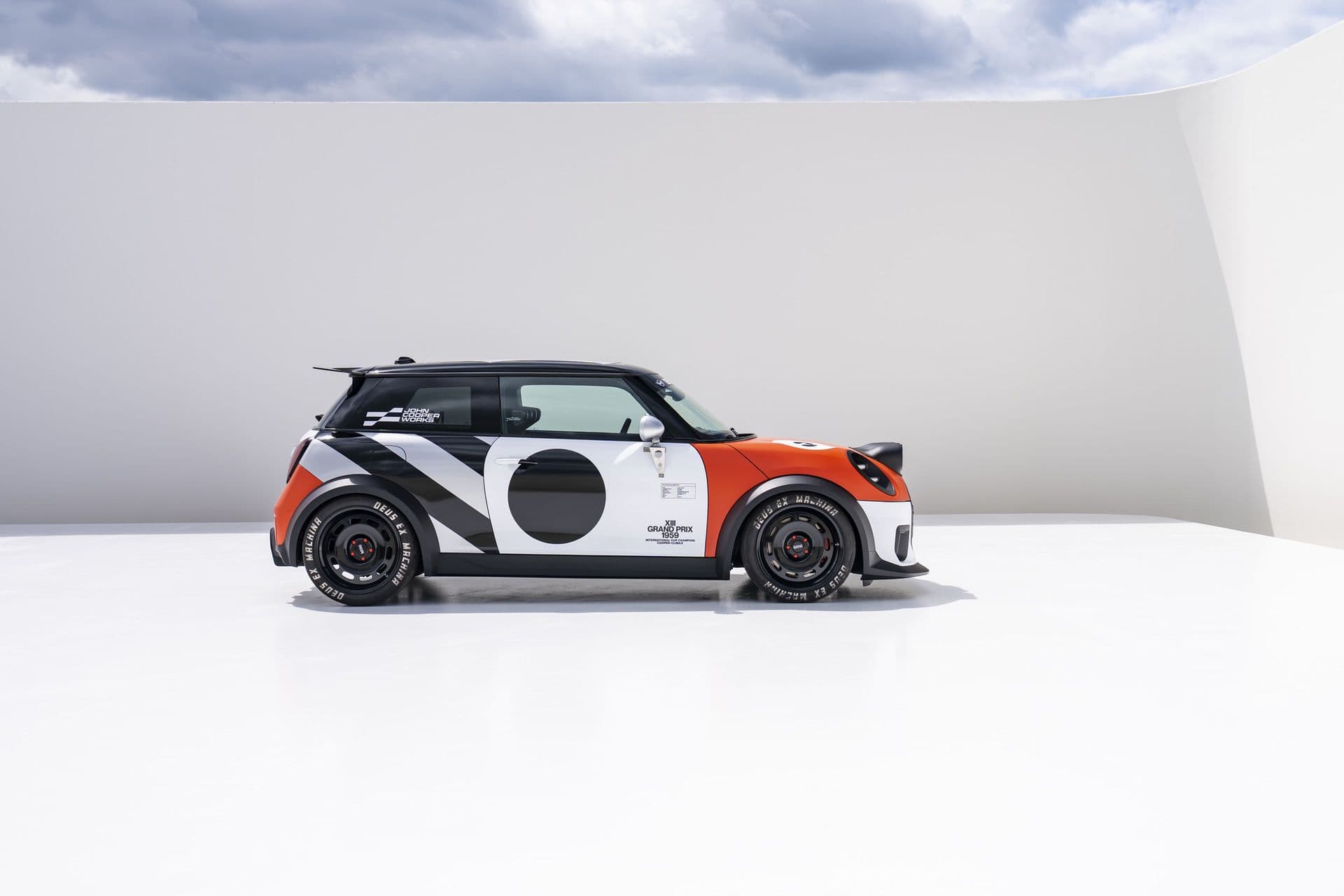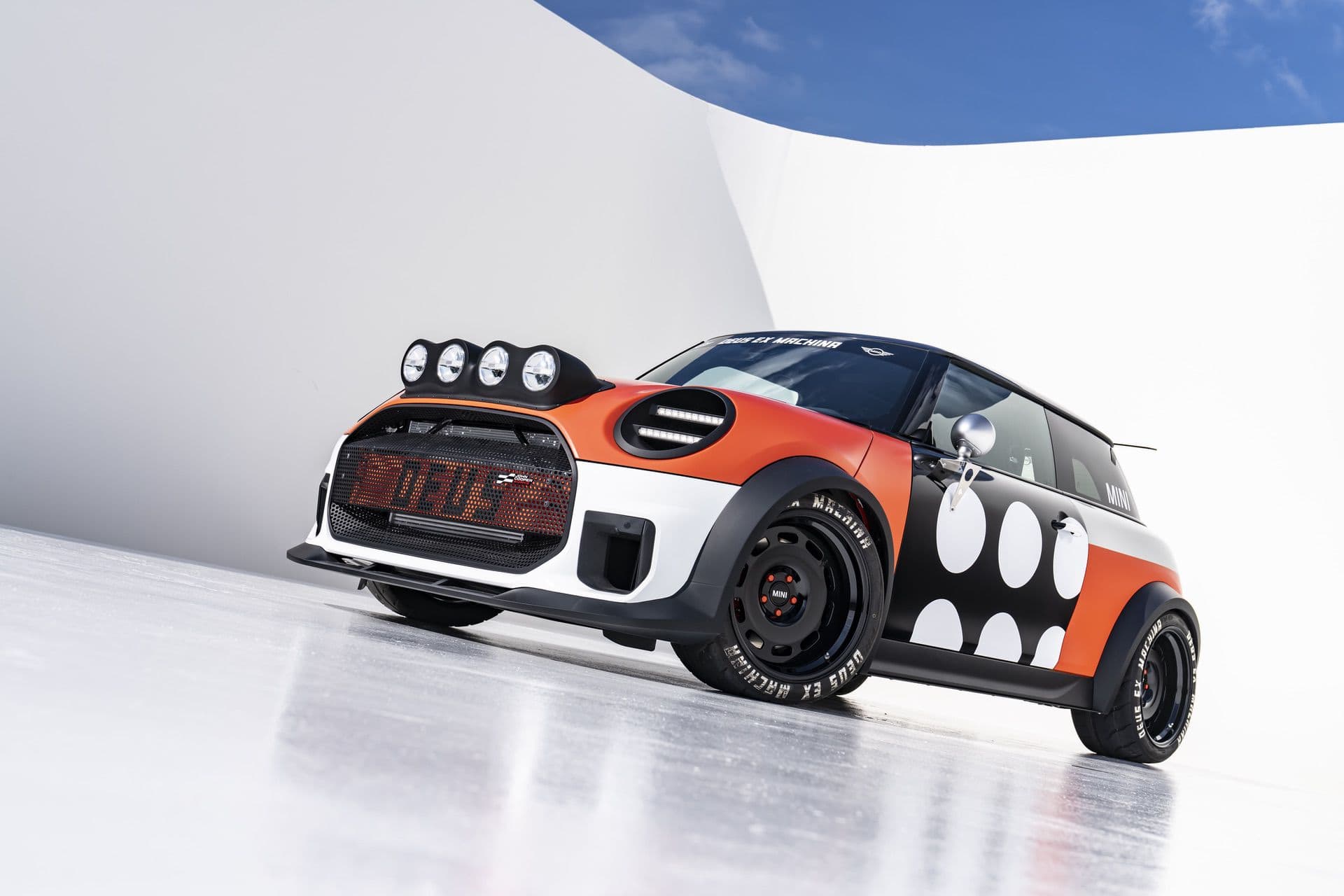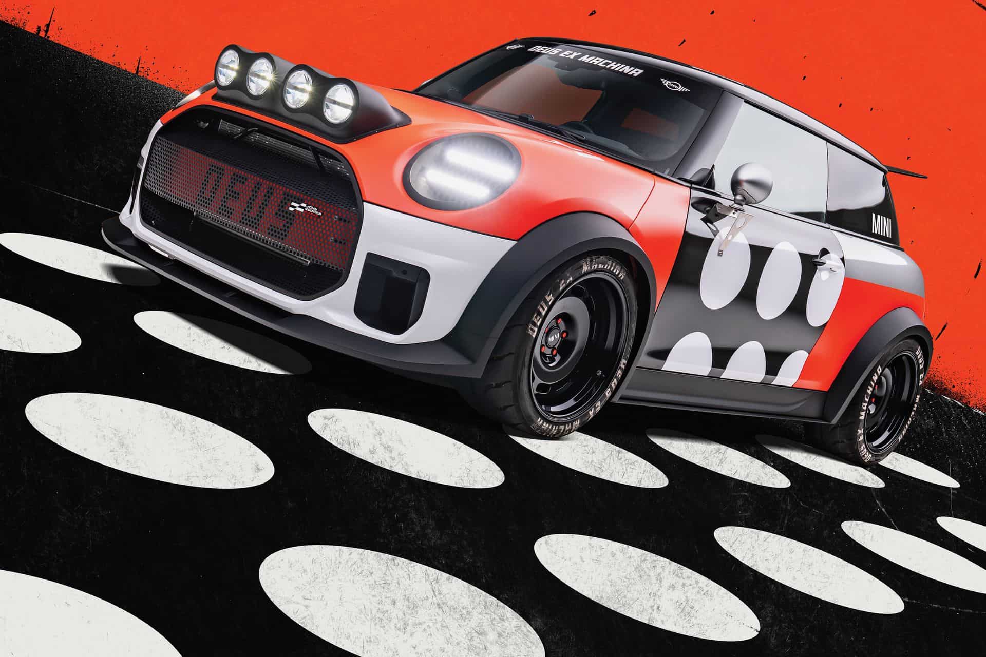 If The Skeg is about the coast, The Machina is about the circuit. The ICE-powered JCW packs 231 horsepower and looks every bit the part of a motorsport throwback. Its widened fenders, quad rally lights, and bold red-white-black livery reference MINI’s competition roots. At the rear, a diffuser inspired by JCW race cars and a Can-Am-style roof wing push aerodynamics and nostalgia in equal measure.