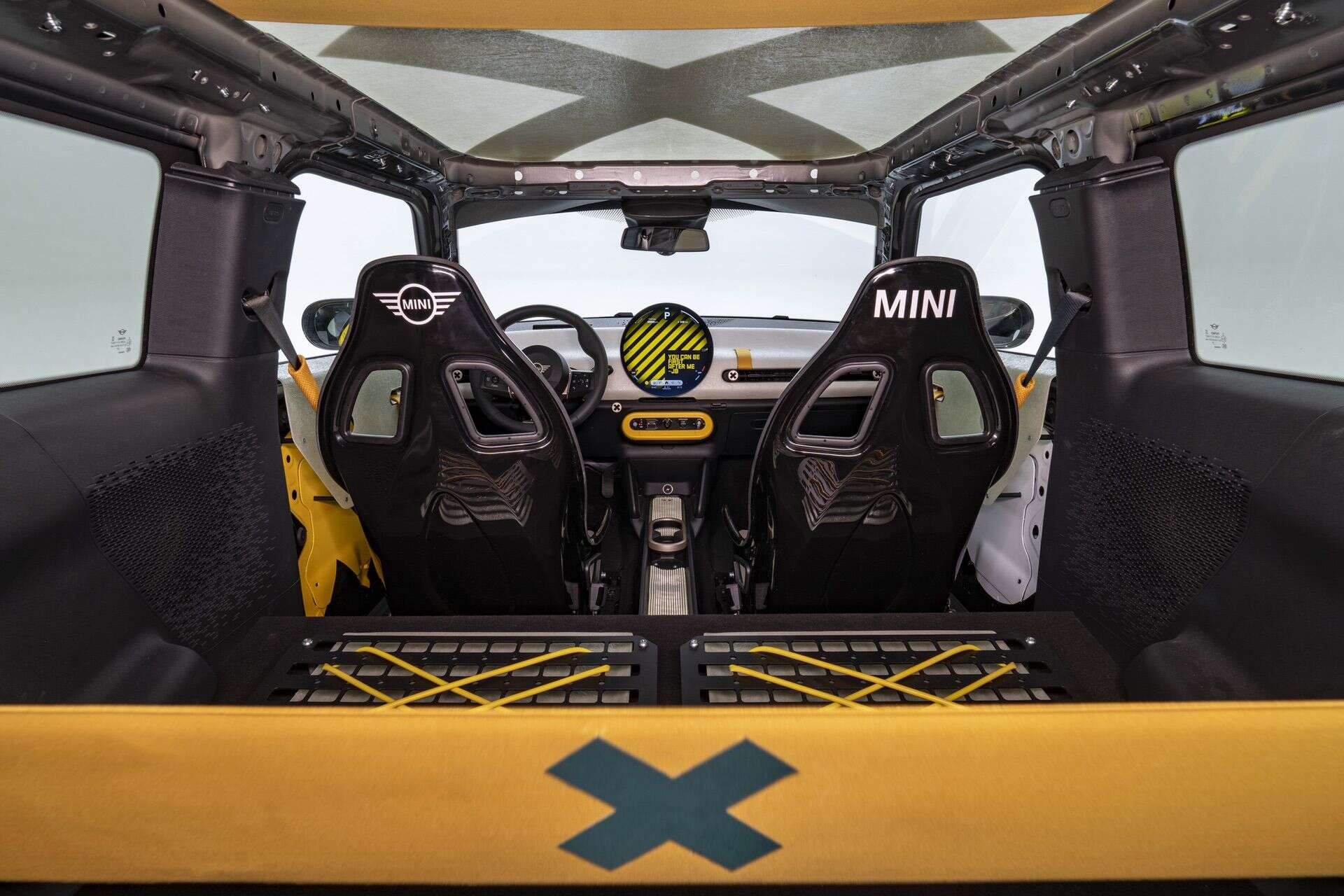 The Skeg channels surf culture as much as it does MINI’s design language. Finished in vivid yellow and silver, it wears wide fenders, an illuminated grille, and a dramatic roof spoiler. Semi-transparent fiberglass body panels shave 15 percent off its weight while playing with light throughout the day. At the rear, a “Flex Tip Surf Spoiler” mimics the concave underside of a surfboard, shaping airflow like a wave.