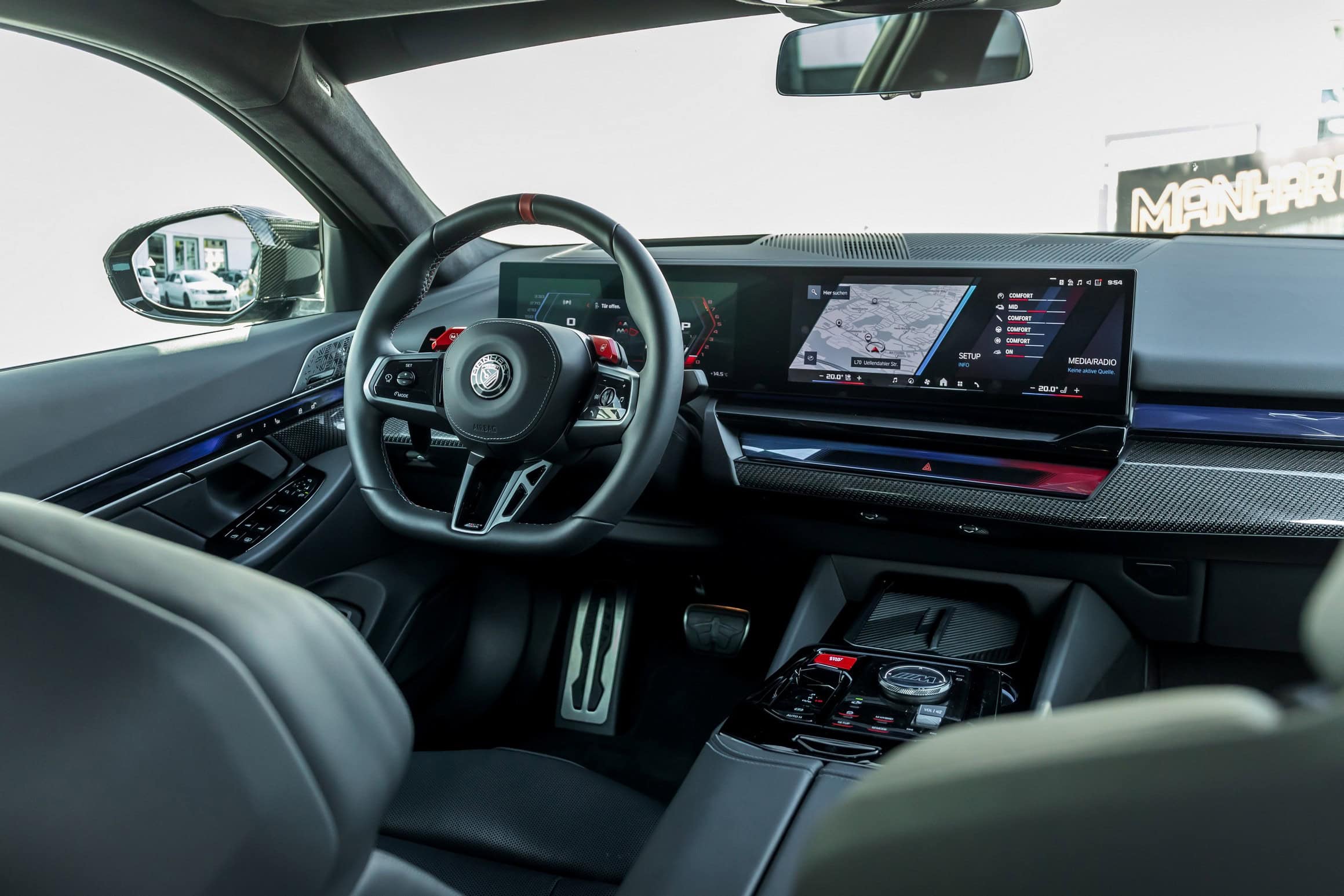 The factory BMW alloys are also gone, swapped for Manhart’s 22-inch forged wheels wrapped in chunky 295/30 front and 315/30 rear tires. These can be paired with Manhart’s lowering springs for extra stance, or with a KW-developed coilover kit.