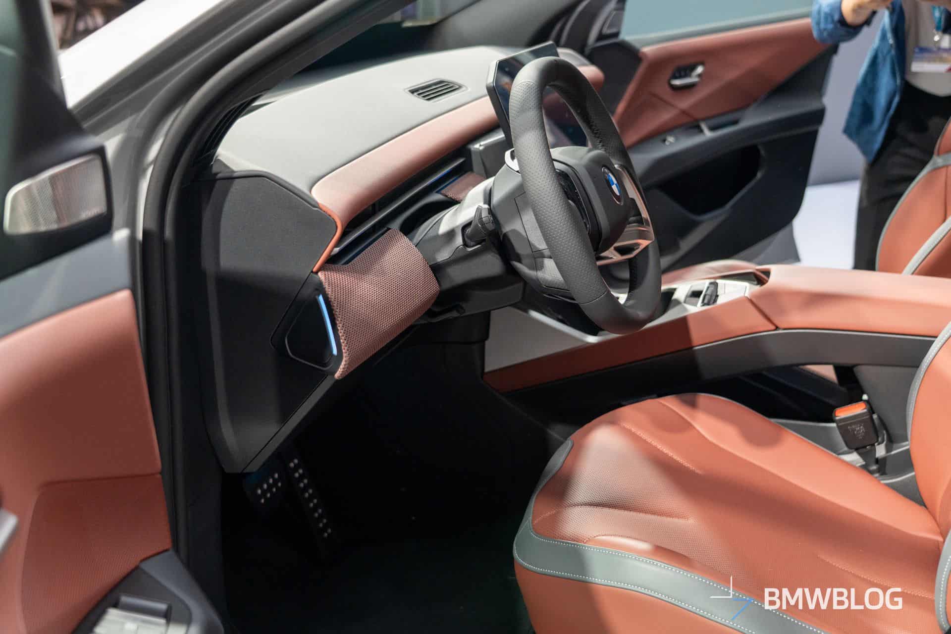 The exterior’s Space Silver paint, or Spacesilber metallic as it’s called on BMW Germany’s iX3 configurator, ultimately pairs well with the M Sport bodywork and large wheels. These bi-color 22-inch wheels are dubbed Style 1054, and they’re the largest you can get on the new iX3. They’re also for M Sport cars only — although there is another 22-inch wheel offering open to all iX3 models. Blue brakes proudly wear M branding behind the huge alloys, further clueing you in that it’s an M Sport model. But things get even more interesting when you open the door.