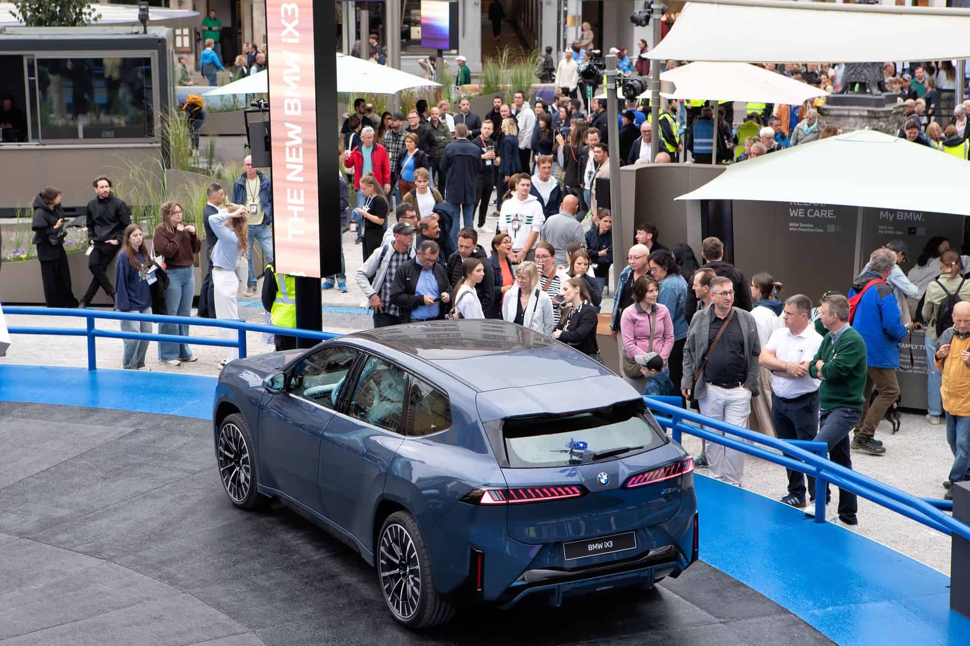 The setting underscored BMW’s ambition for the Neue Klasse. The reduced, more timeless design language introduced by the Neue Klasse platform was on full display, with new retractable door handles, smoother surfacing, and an illuminated interpretation of the kidney grille. In Space Silver, the sharp creases and sculpted lines reflected the classical façades of the square, while Ocean Wave Blue gave the car a more emotional character, shifting tone depending on the angle of the sun or the artificial lighting used in the installation.