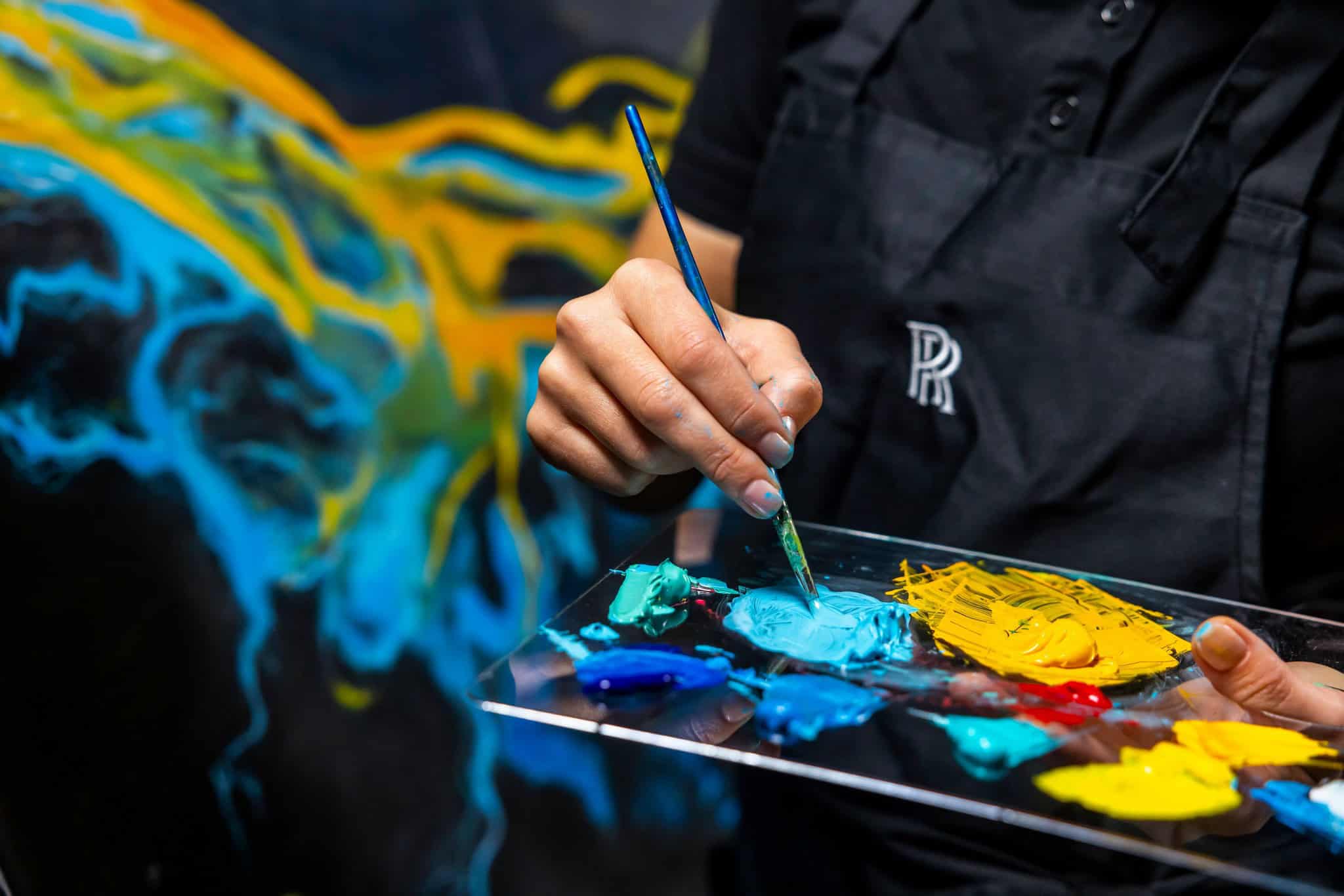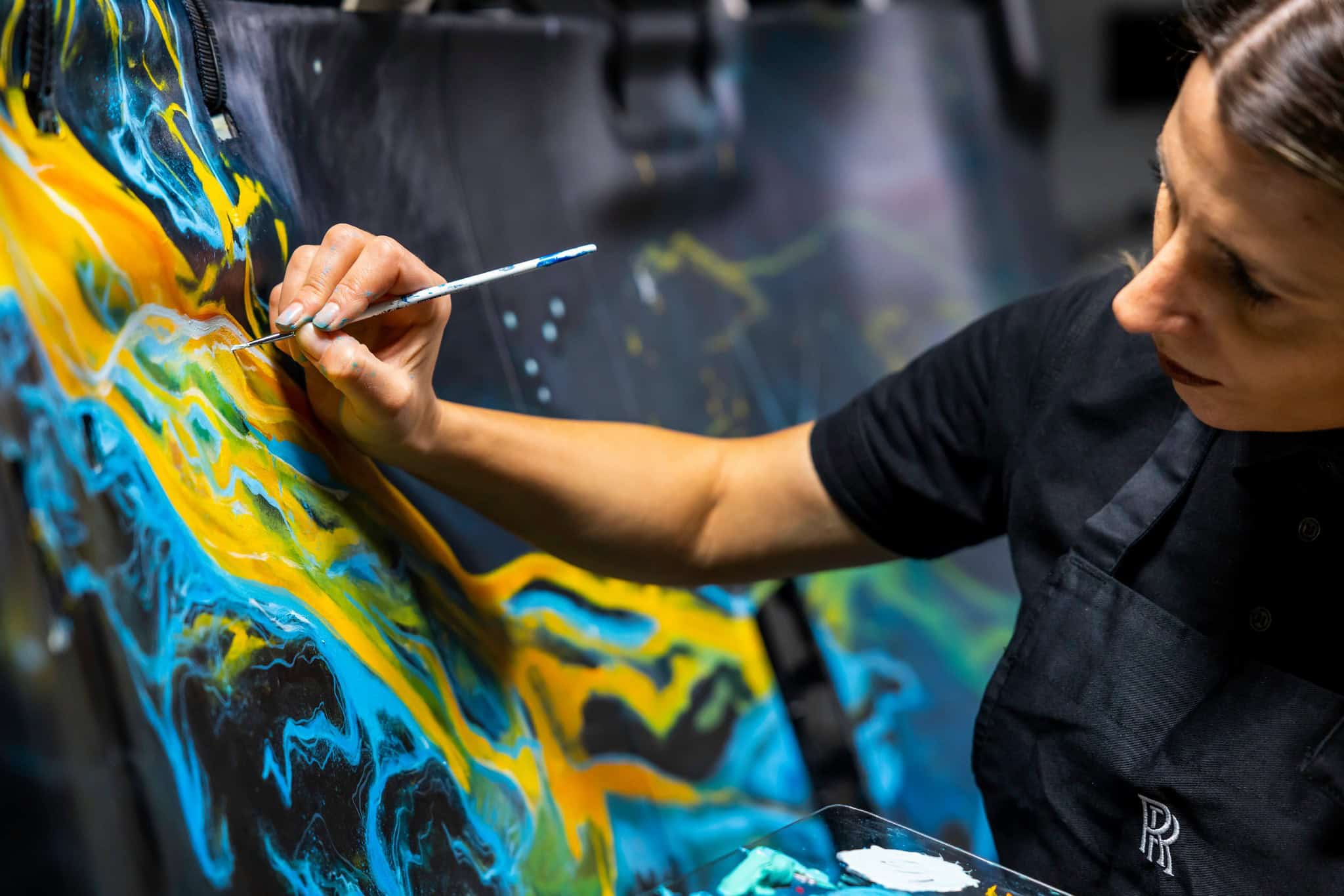 A one-of-one commission, the posh living room on wheels is the first Rolls-Royce to feature a fully hand-painted Starlight Headliner. More than 160 hours went into painting the ceiling to resemble the Milky Way. Acrylic paint was applied with a makeup brush in areas where a mist effect was desired.