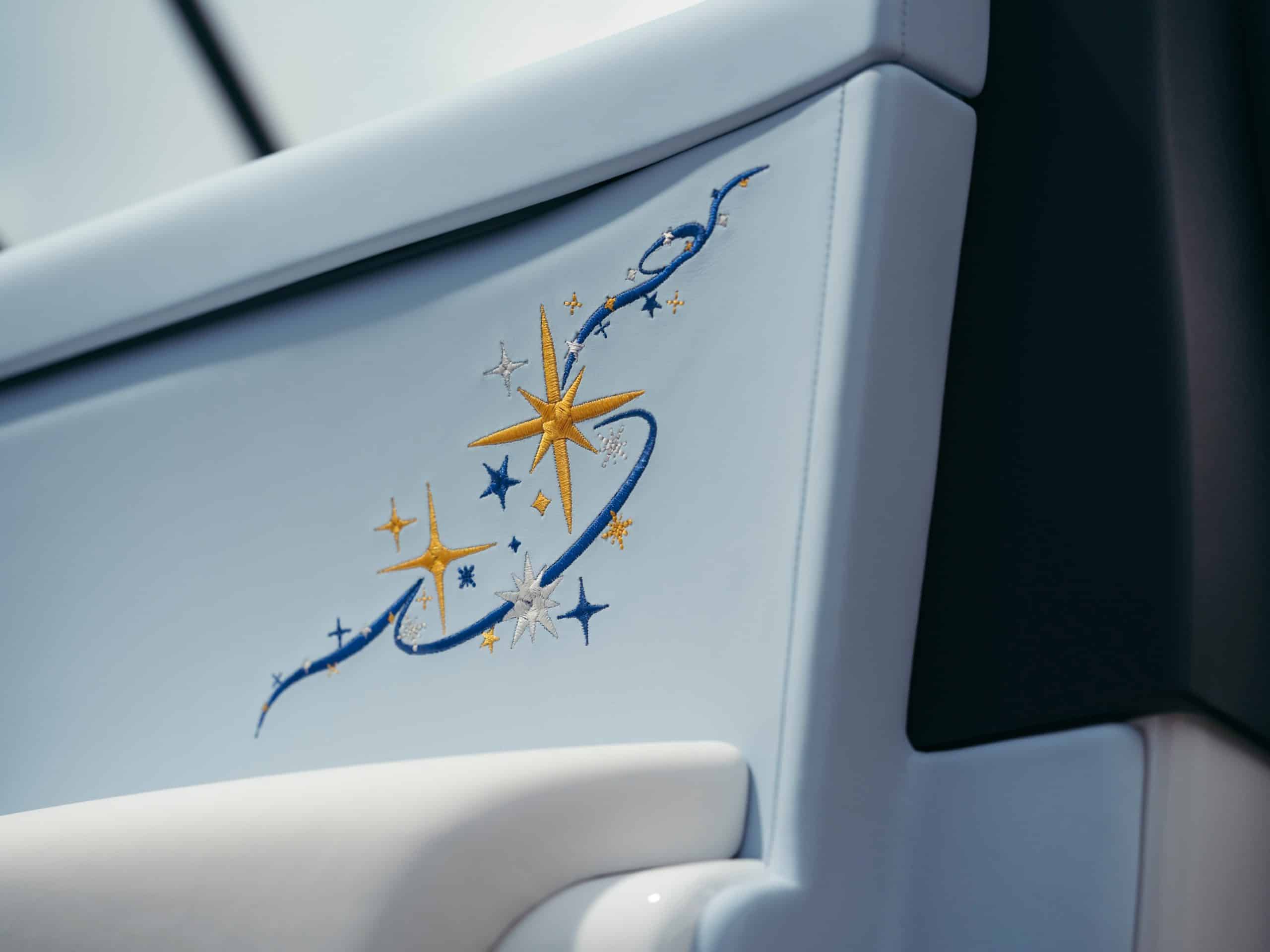 Multiple brushes were used for the starry headliner, along with more than 20 layers of paint to capture the “drama of outer space.” The star motif also extends to the headrests and door panels, as well as the passenger side of the dashboard, which features additional hand-painted details. Charles Blue and Grace White leathers cover nearly every surface, paired with a Piano White trim. Special badges on the side sills mark this as no ordinary Cullinan, if such a thing exists at all.