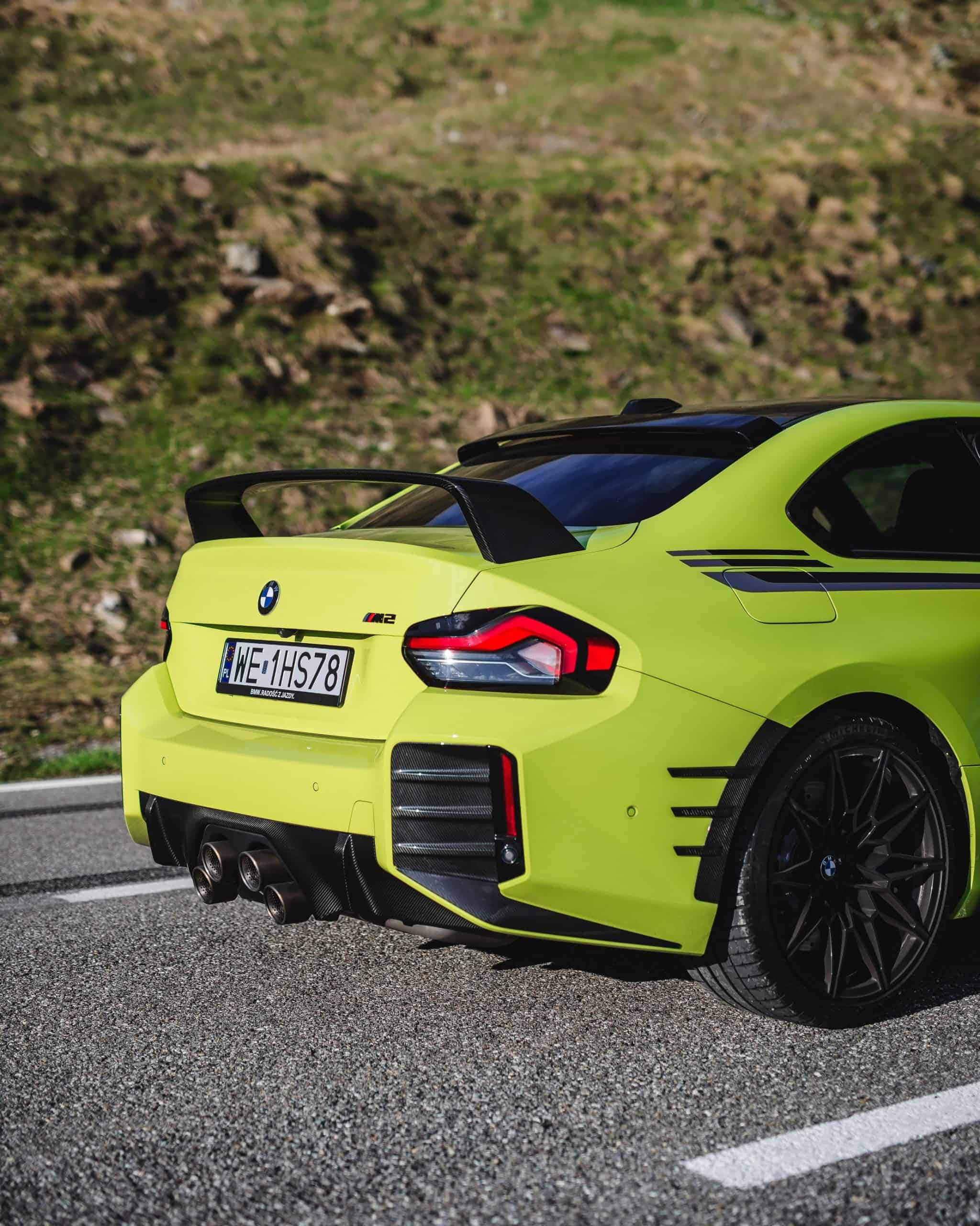 Whoever configured this M2 spared no expense. The rear-wheel-drive coupe is a veritable carbon-fiber showcase. From the front attachment and air inlet trims to the side spats and rear wing, carbon is everywhere. There’s even a rear spoiler at the top of the rear glass, paired with a redesigned diffuser.