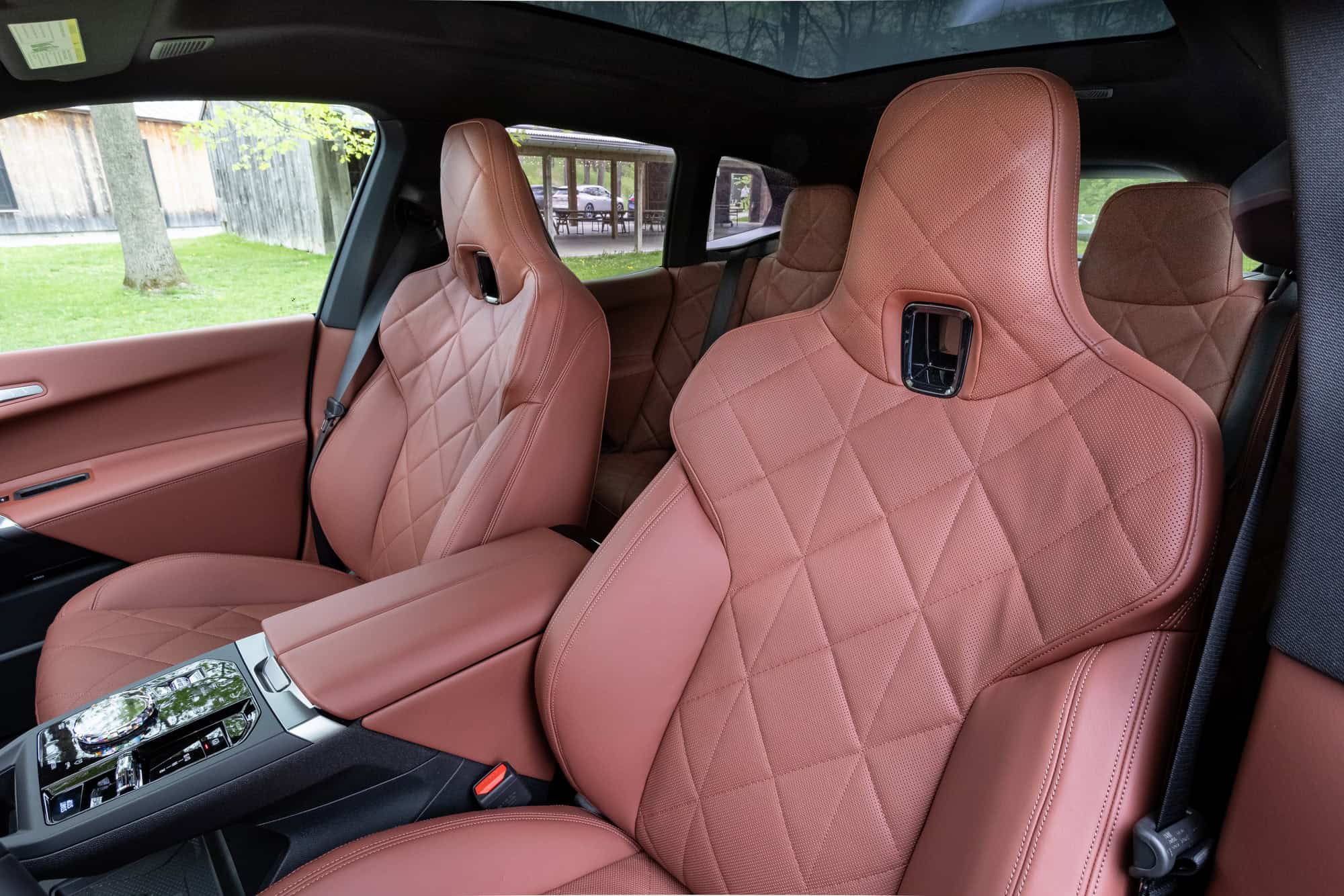 The Castanea Chestnut leather interior looked incredible and felt expensive. The seats offer heating, cooling, and massage functions. The crystal seat and iDrive controls only add to the upscale feeling. The Bowers & Wilkins sound system is the best I’ve heard in any modern car. The rigid chassis from the EV architecture, along with the inclusion of carbon fiber and the incredibly effective sound deadening, doesn’t just make for a more luxurious experience—it enhances the sound system’s ability to deliver clean, distortion-free audio.