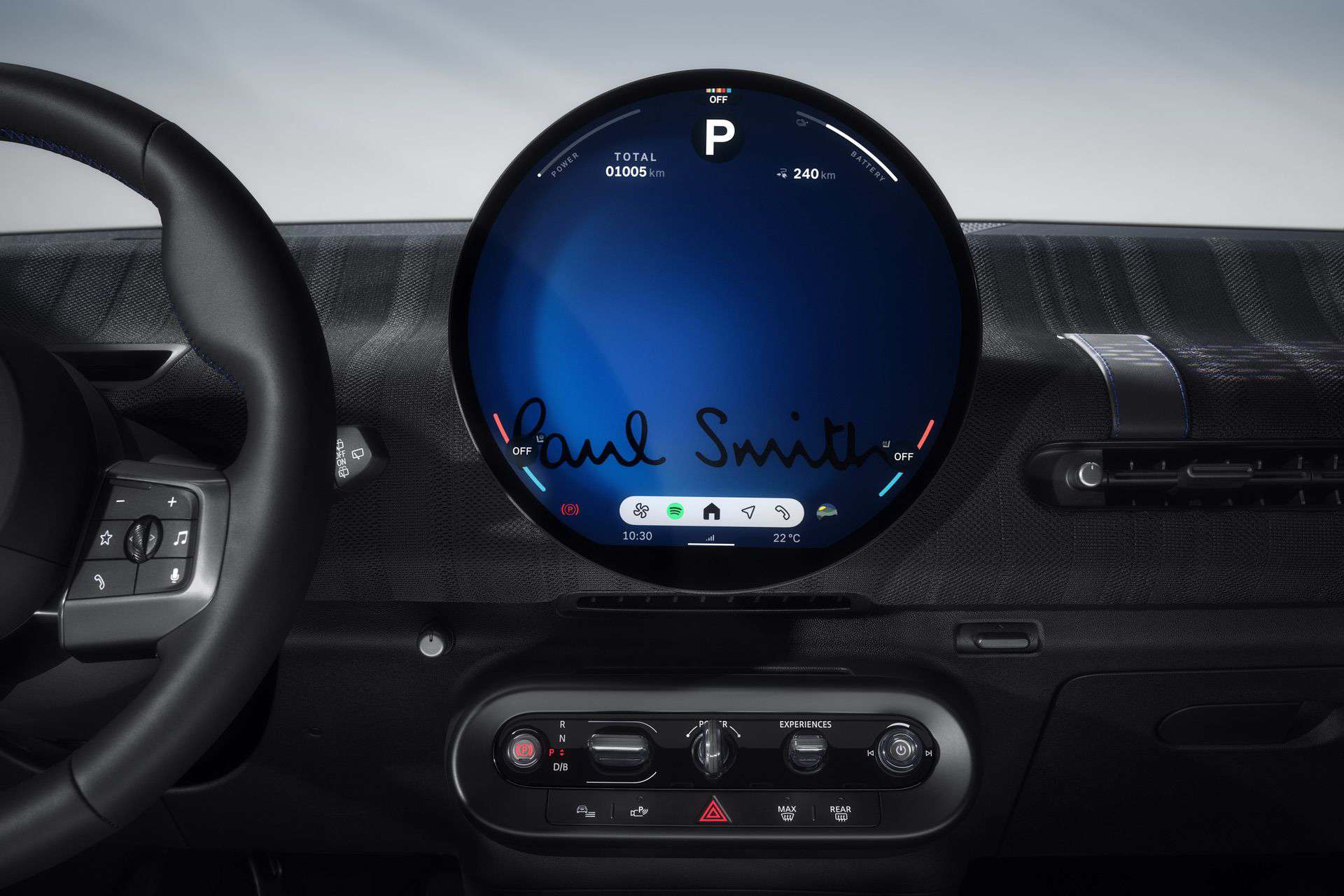 Inside, the design takes a restrained yet refined approach. The dashboard is wrapped in authentic Paul Smith-branded striped fabric, and the steering wheel’s lower spoke features the same signature motif. Knitted textiles accent the seat shoulders and headrests.