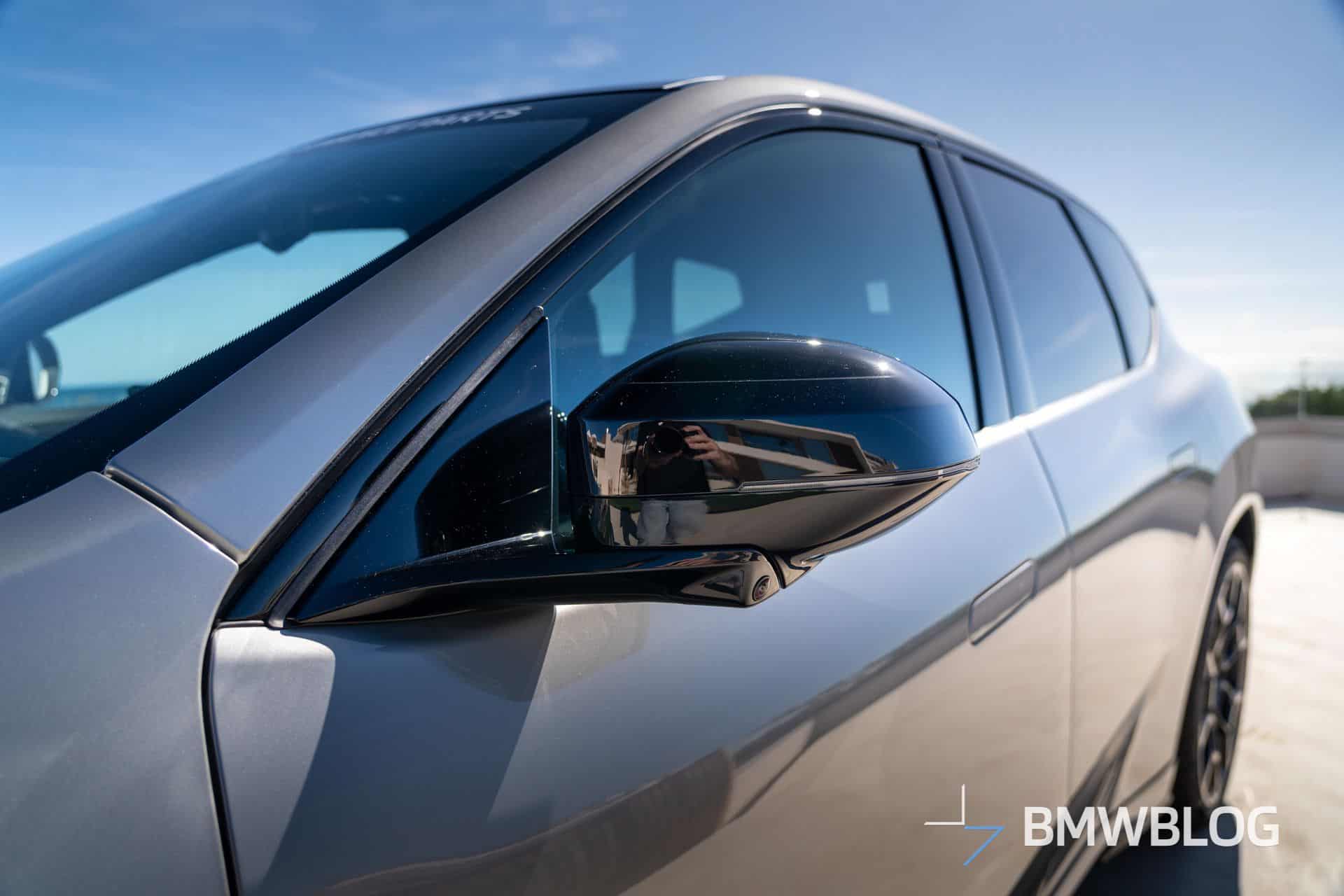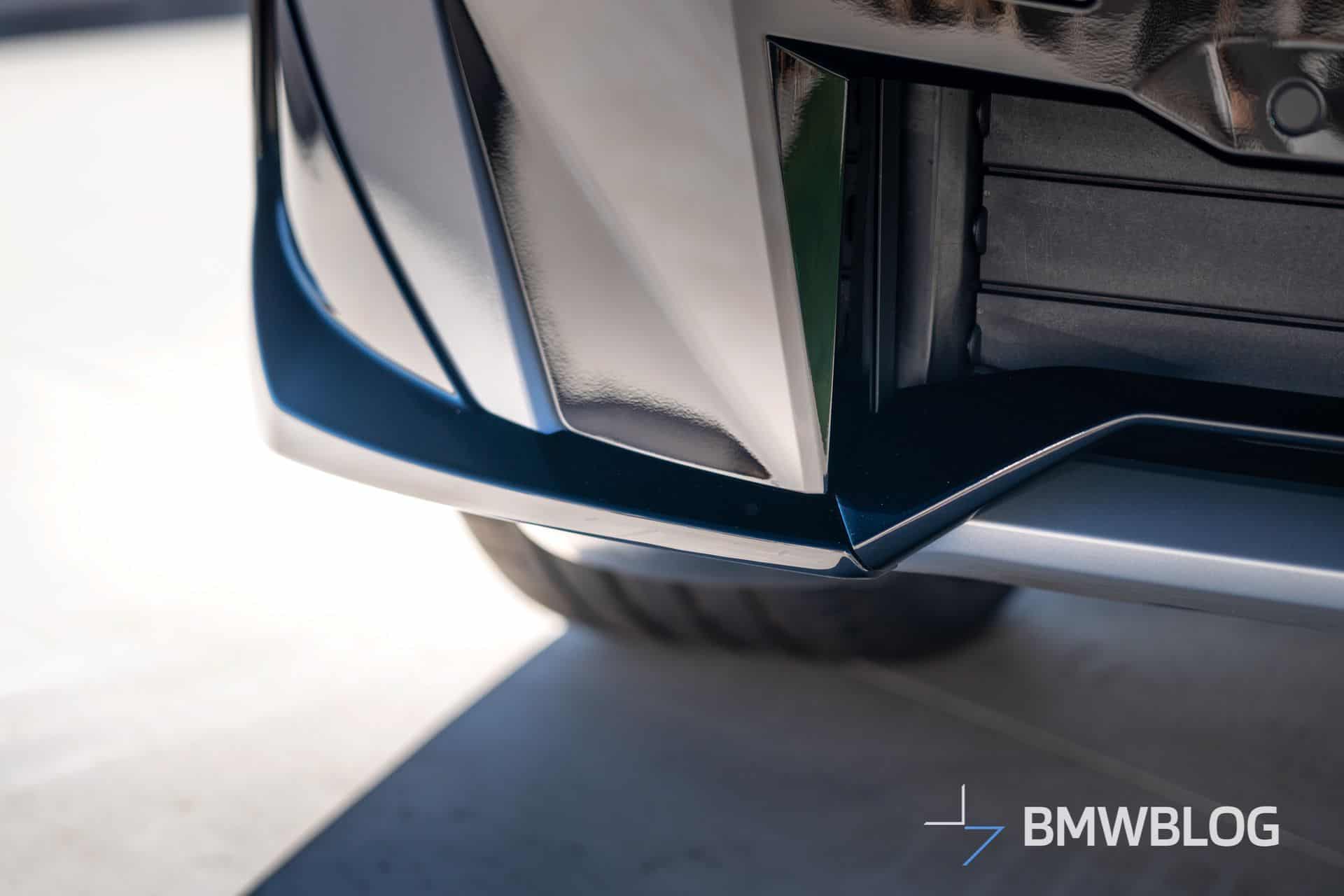 We photographed the electric SUV in Spain with several exterior add-ons. Up front, glossy black attachments integrated into the lower air intakes build upon the M Sport Pro Package, giving the car a more cohesive look. The 22-inch 1054 M wheels replace the usual two-tone design with a matte black finish featuring M Performance branding.