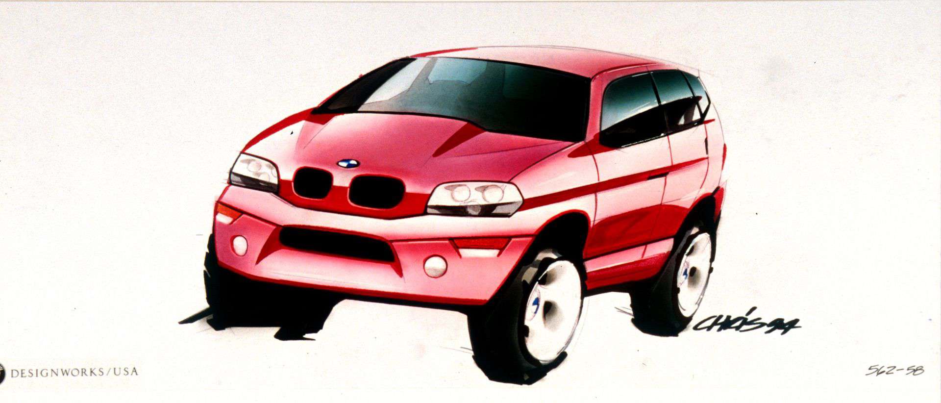 BMW asked Designworks to explore what a BMW SUV could be, and the results came quickly. The studio’s early sketches of what would become Project E53 were astonishingly close to the production car. Even the first drawing — including a sharply angled Hofmeister kink — already captured the proportions and stance that would define the X5. The assignment then shifted to Munich where designer Chris Chapman, who had joined Designworks after several years at Isuzu, began shaping the X5’s form alongside Chris Bangle.