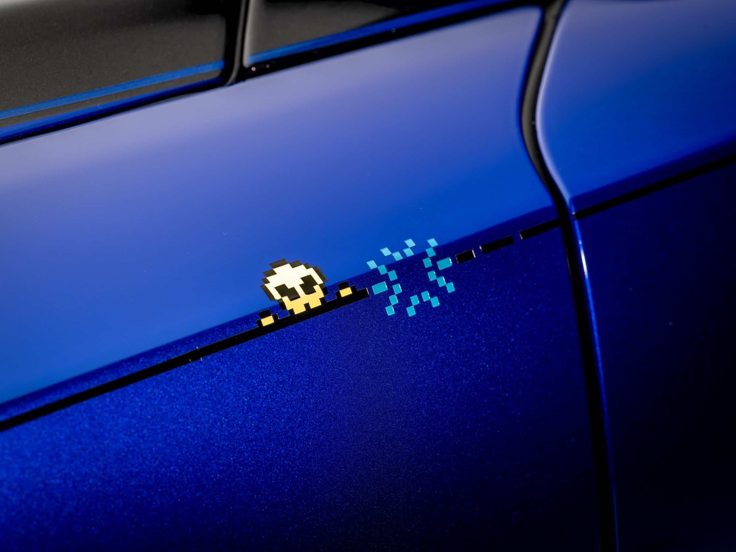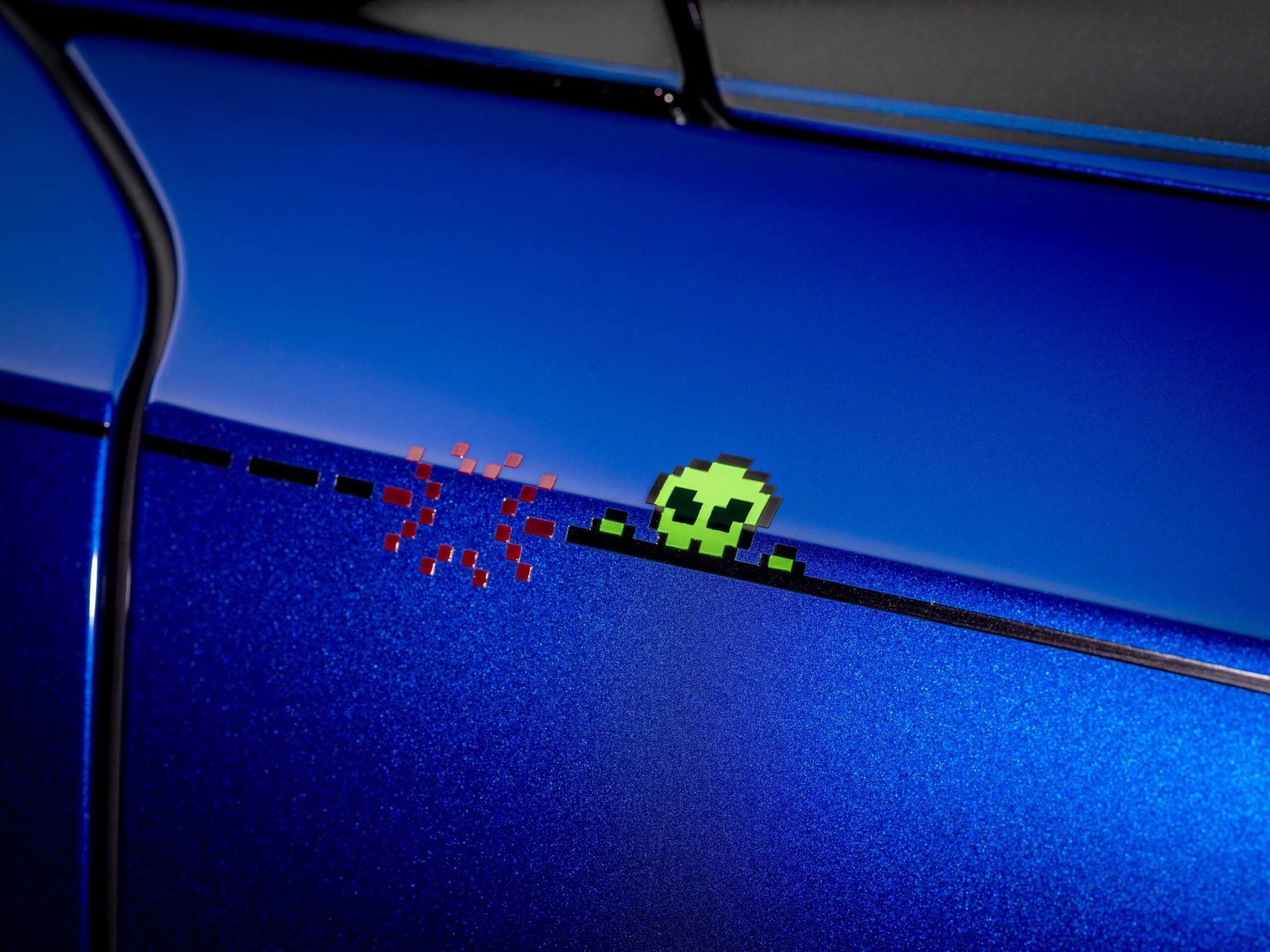 So, what does? It’s the coachline separating the two colors, which expresses the client’s soft spot for video games from a bygone era. The so-called “Cheeky Alien” sits next to an 8-bit explosion hand-painted in different color combinations depending on the side of the car. There are no fewer than 89 individual pixels, each measuring 3×3 mm, recalling what enthusiasts know as the third generation of video game consoles.