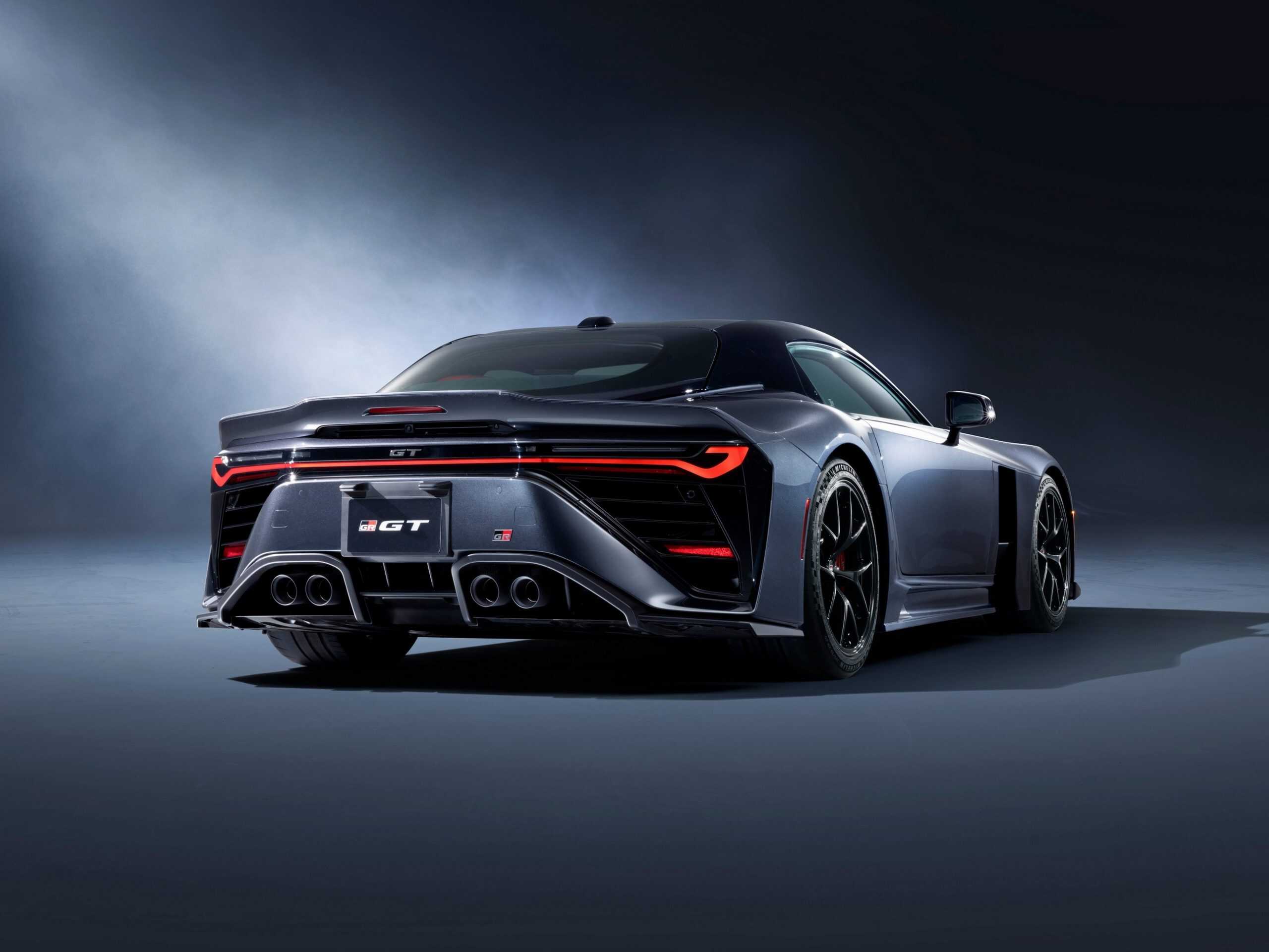 The menacing two-seater, complete with a quad exhaust system, features CFRP and aluminum body panels to keep weight down. Toyota says the GR GT won’t exceed 1,750 kg, though the aim is to go lighter. To that end, it’s actually the company’s first car to use an all-aluminum body frame.