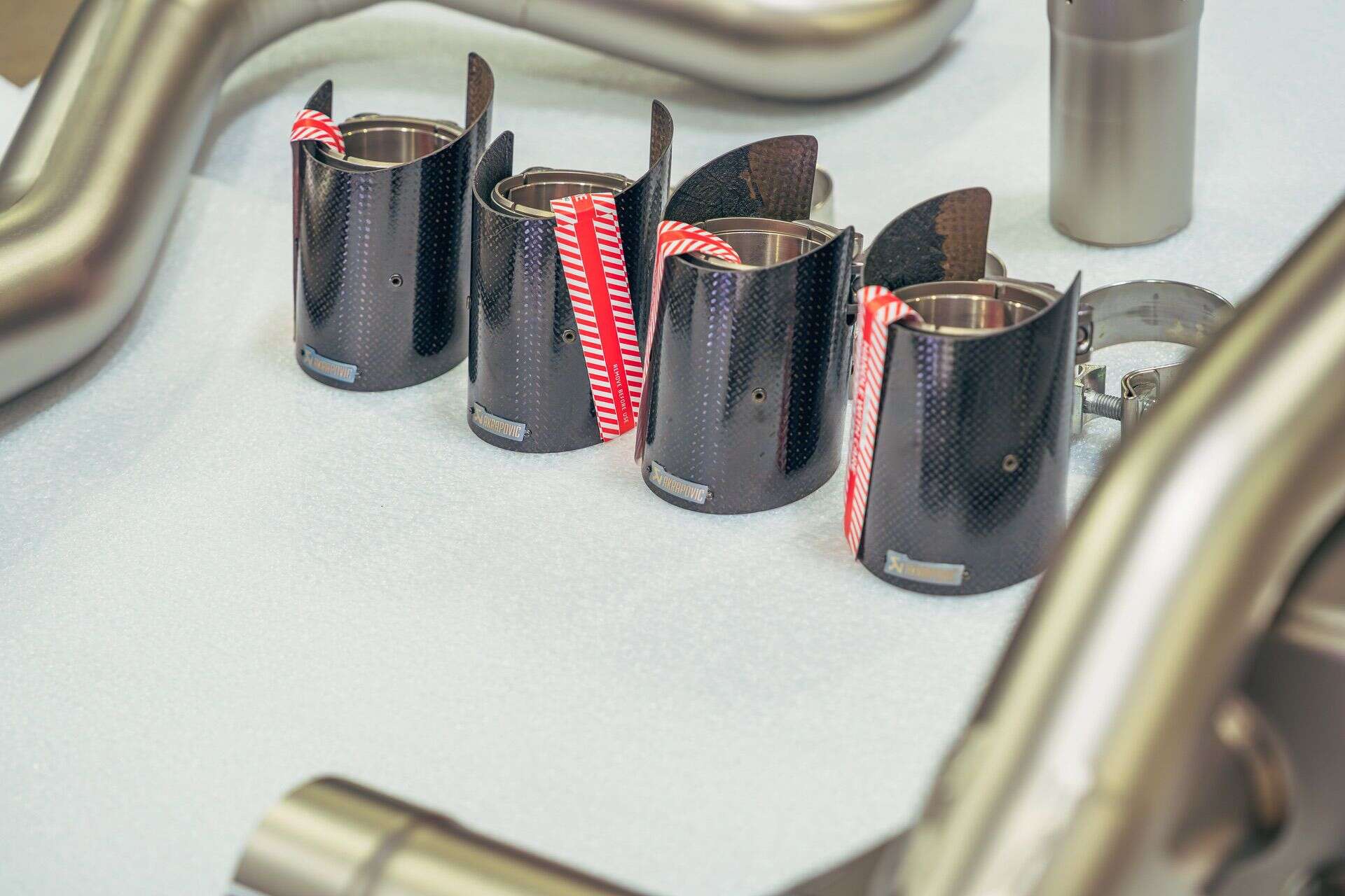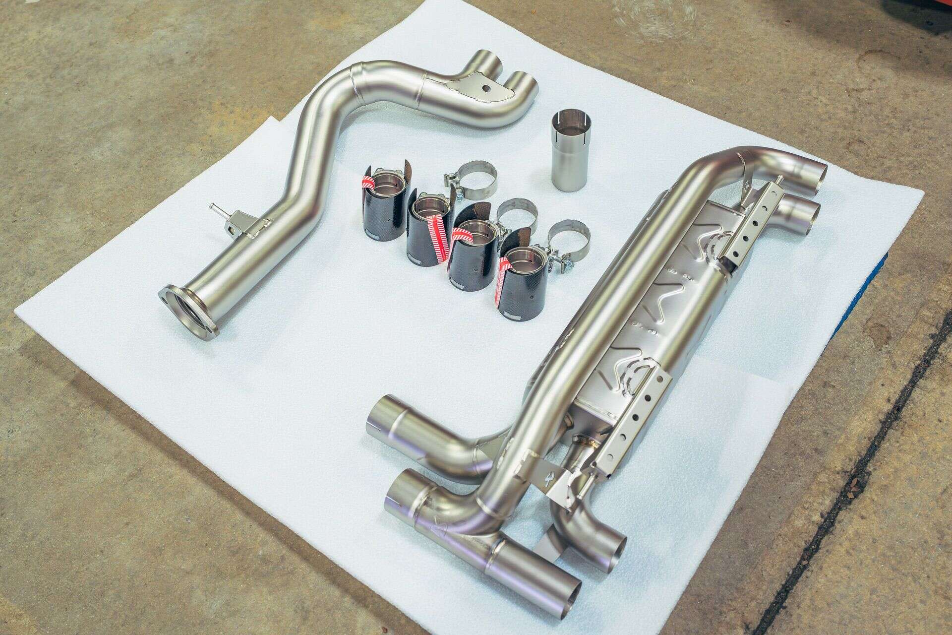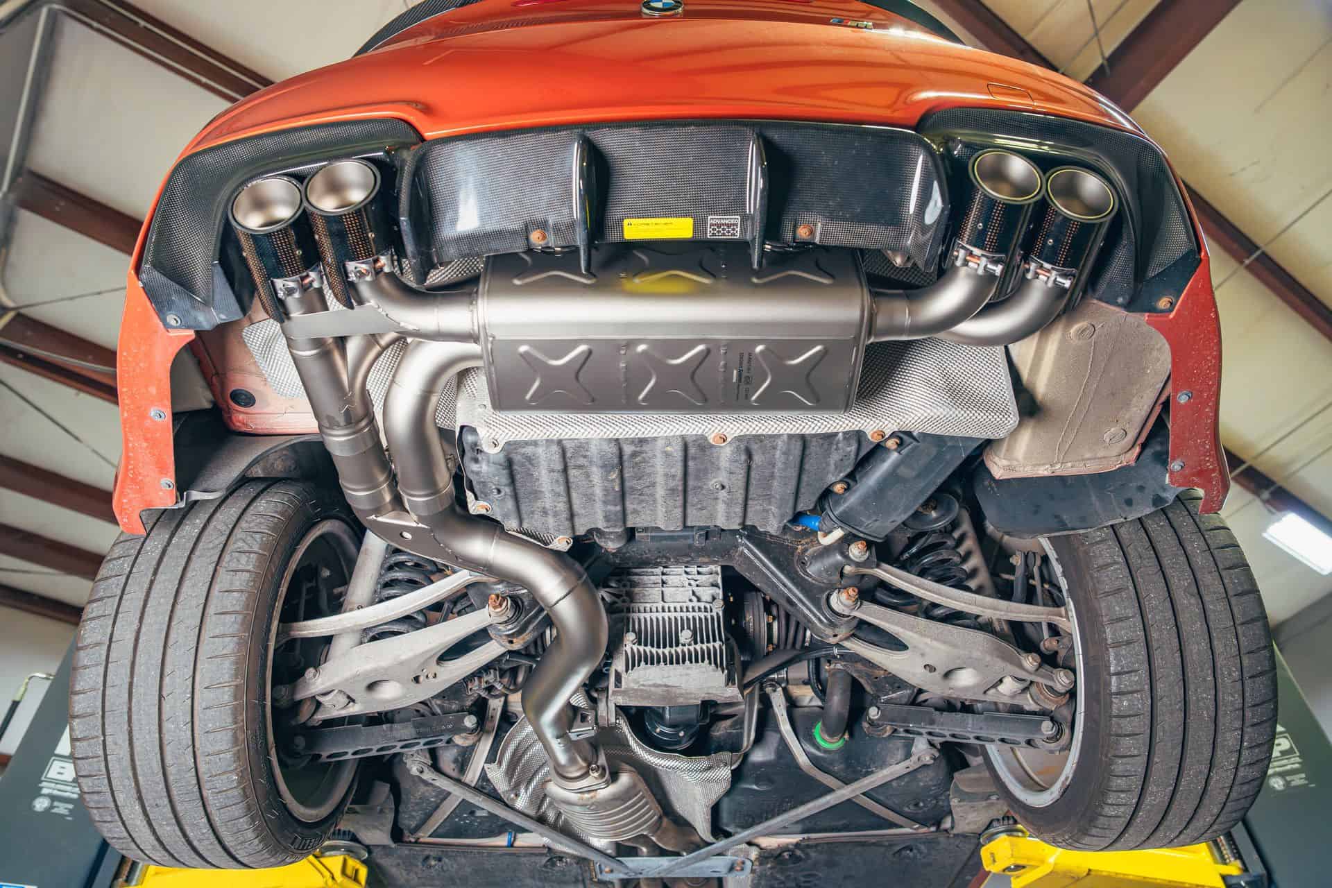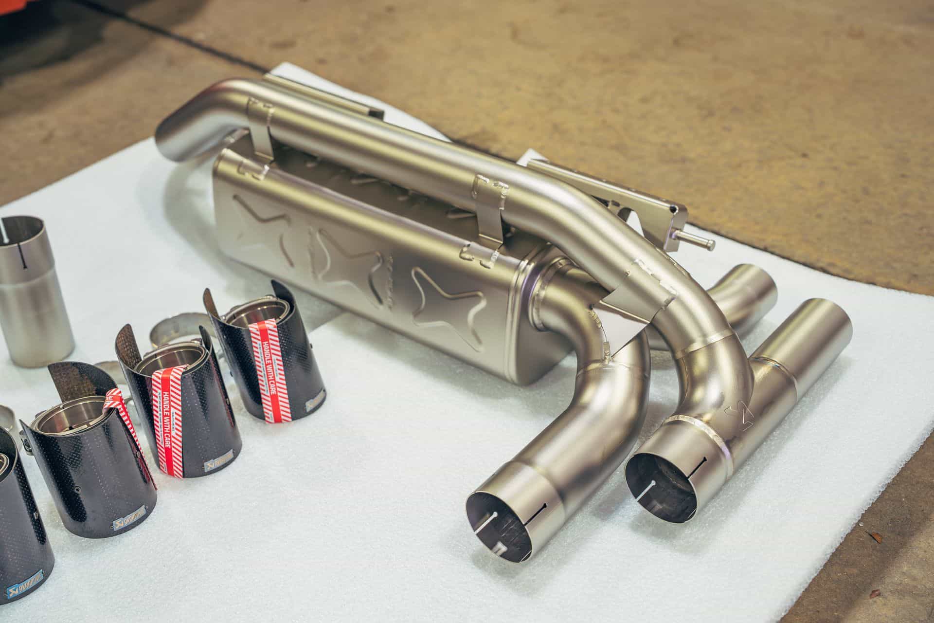 Before the actual service work, I made a few decisions to take the car closer to stock. I pulled the Eisenmann Race exhaust — fun, loud, and sometimes too much — and replaced it with an Akrapovič slip-on paired to the factory mid-pipe. I also added some awesome carbon fiber tips. The sound is still special, just more livable and less attention-seeking. I also removed the M Performance steering wheel with the LED display and put the original wheel back in. No performance gain there, just a return to how the cabin is supposed to feel. Simple, OEM, not trying hard.